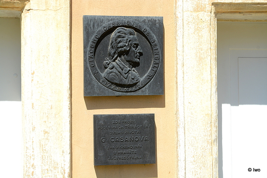 Na fasádě budovy na severní straně zámeckého nádvoří v Duchcově je mezi dveřmi umístěna pamětní deska Giacoma Casanovy de Seingalt.