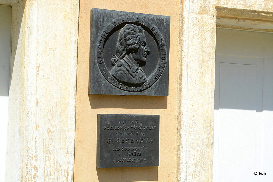Mezi dveřmi je v horní části čtvercová deska s reliéfem, kolem něhož po obvodu nápis „Giacomo Casanova de Seingalt“, ve spodní části pak „✦ 1725 † 1798“.