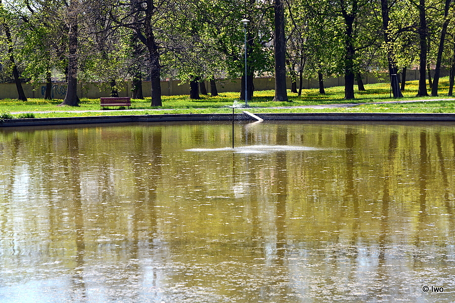 V parku se nachází množství vzrostlých stromů a nádrž s vodou.