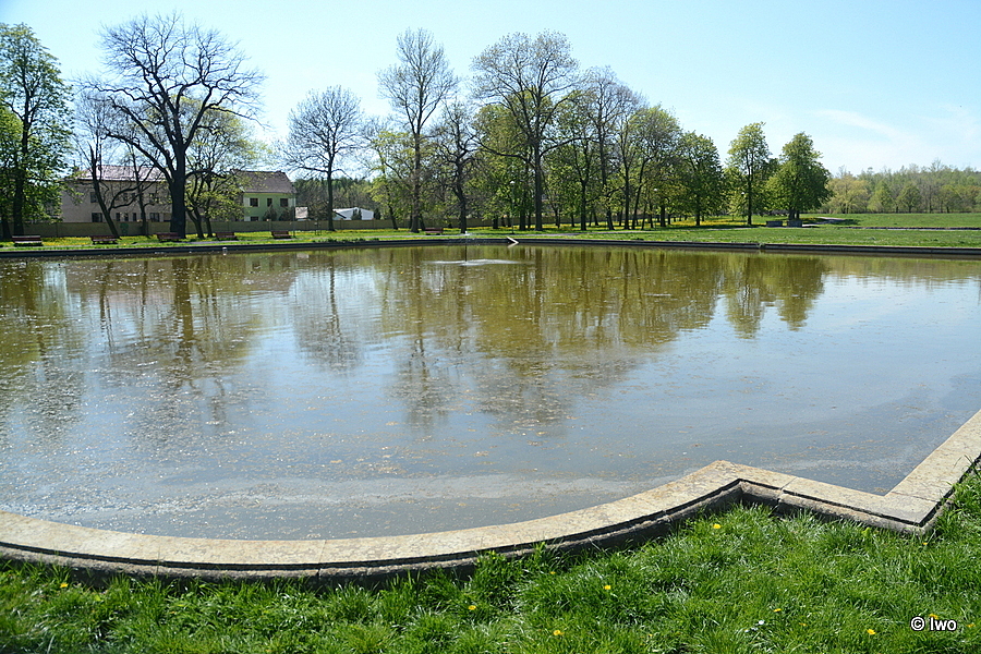 V ploše zámeckého parku mezi samotným zámkem a bývalým zbořený špitálem je umístěn bazén s vodotryskem.