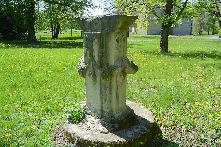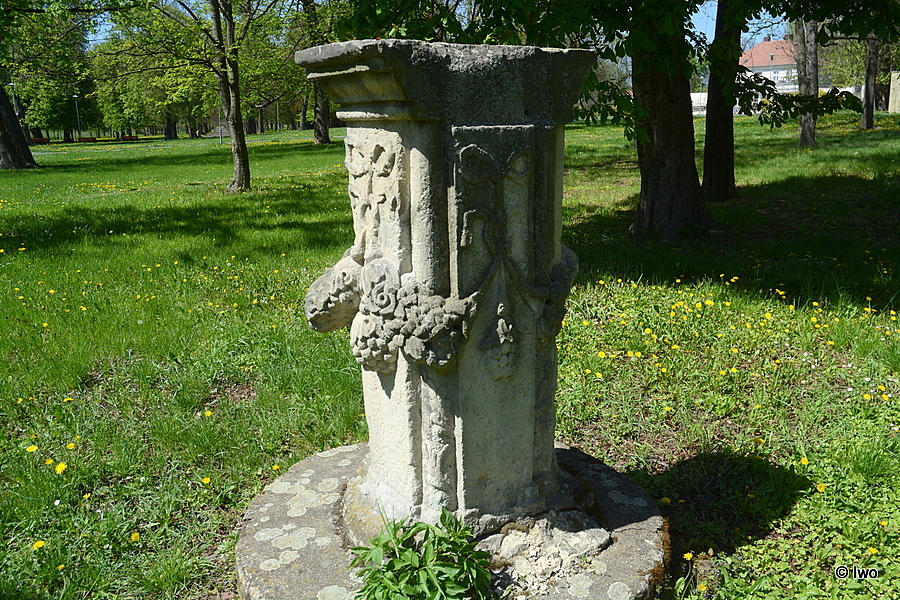 V prostoru mezi pavilonem Reinerovy fresky a Knížecí zahrady v zámeckém parku v Duchcově stojí zdobný podstavec.