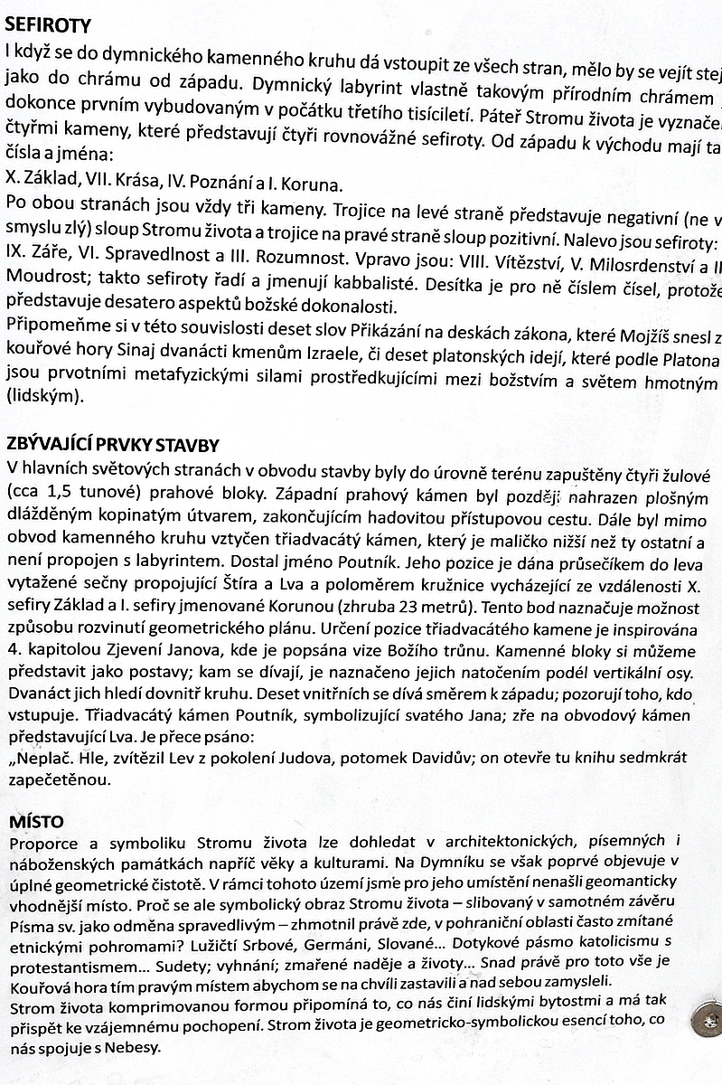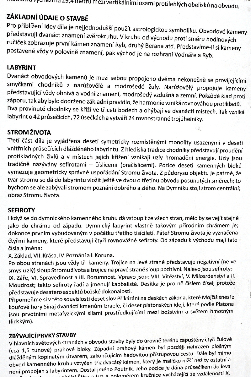 Do kamenného kruhu na Dymníku o průměru třicet metrů lze samozřejmě vstoupit ze všech stran, ale mělo by se přijít po chodníku a vejít dovnitř od západu, stejně jako se vchází do chrámu. Uvnitř hvězdy je deset symetricky rozmístěných monolitů, které jsou usazeny v průsečících dlážděného labyrintu. Desítka je číslem čísel, protože představuje desatero aspektů božské dokonalosti. Deset slov bylo na Deskách zákona, které snesl Mojžíš z hory Sinaj. A podle jednoho z mýtů si z biblické hory odnesl ještě tajné učení, do kterého následně zasvětil „sedmdesát starců“, mudrců národa. A z toho se vyvinula kabala, židovské mystické učení. Nejdůležitějším a jedinečným symbolem kabaly je „strom života“, jenž vznikl rozvinutím a uspořádáním hexagramu, který zpočátku přijala židovská víra za svůj mistrovský znak. Tyto kameny tvoří strom života a mají také svá čísla i jména: I. koruna (keter), II. moudrost (chokma), III. pochopení (bina), IV. milost (chesed), V. síla (gebura), VI. milosrdenství (rachamim), VII. vítězství (necach), VIII. chvála (hod), IX. základ (jesod), X. královská moc (malchut).