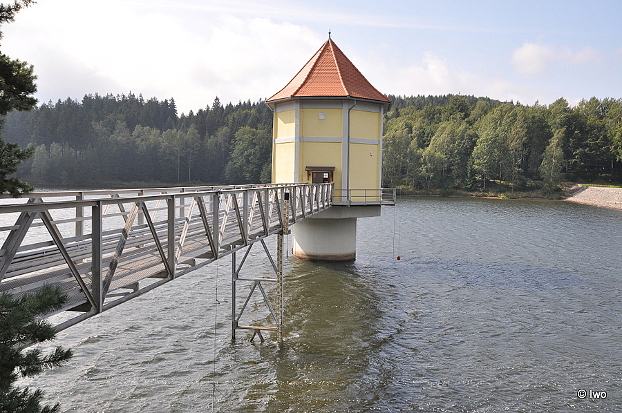 Věž nad vodní hladinou je nová, původní objekt byl zbourán a nahradil jej betonový věžový objekt výšky 26 m (cca 21 m je pod hladinou) a vnějšího průměru 4,7 m. Vede k ní z břehu 40 m dlouhá lávka, vnitřek ve tvaru osmistěnu ukrývá strojovnu a odběrná potrubí. „Surová“ voda je prodávána společnosti Severočeské vodovody a kanalizace, která má ve Chřibské úpravnu a vyrábí z ní pitnou vodu.