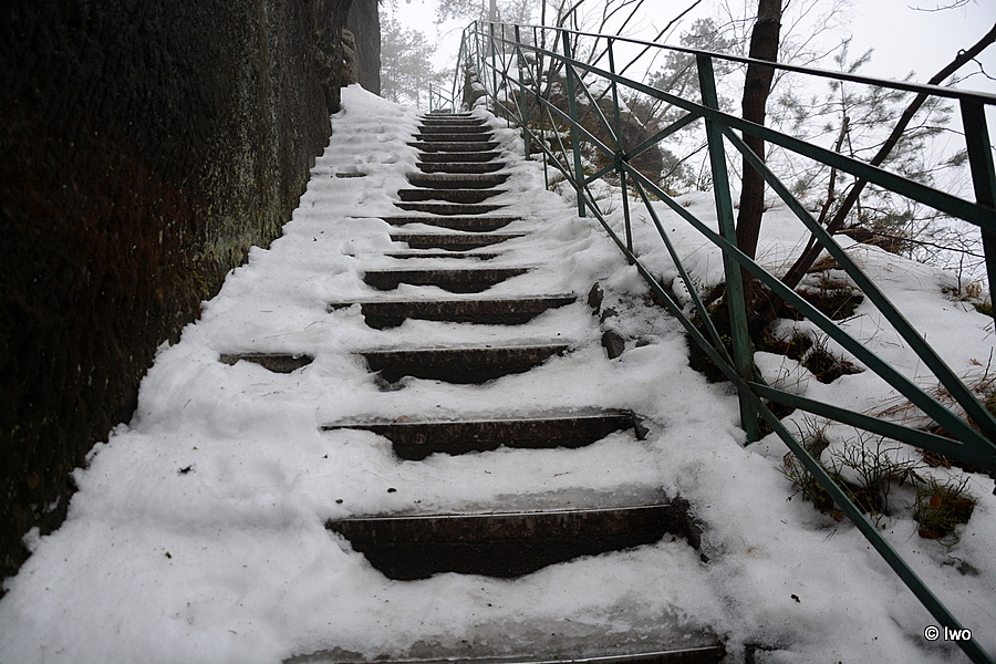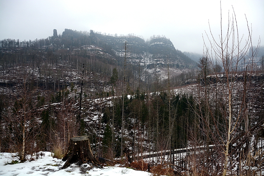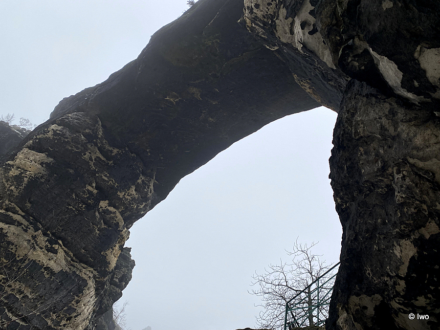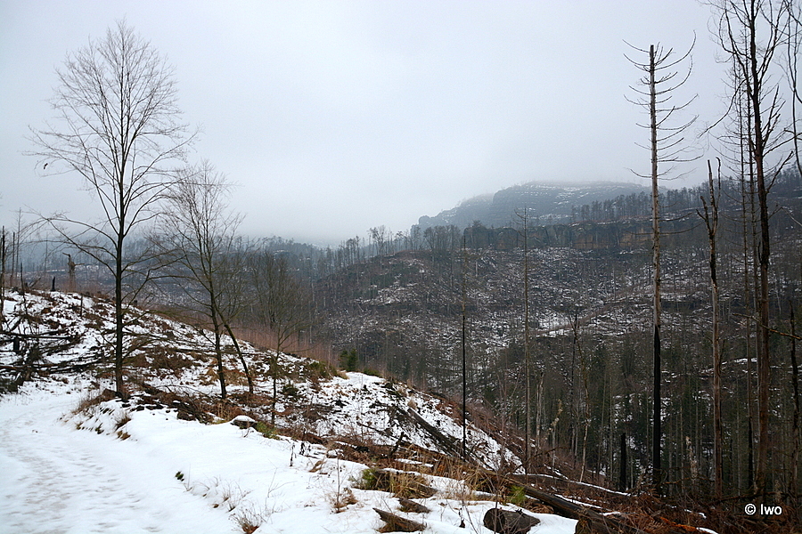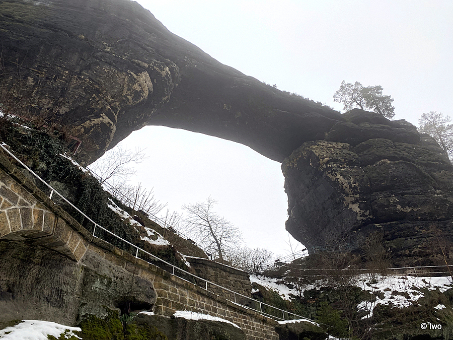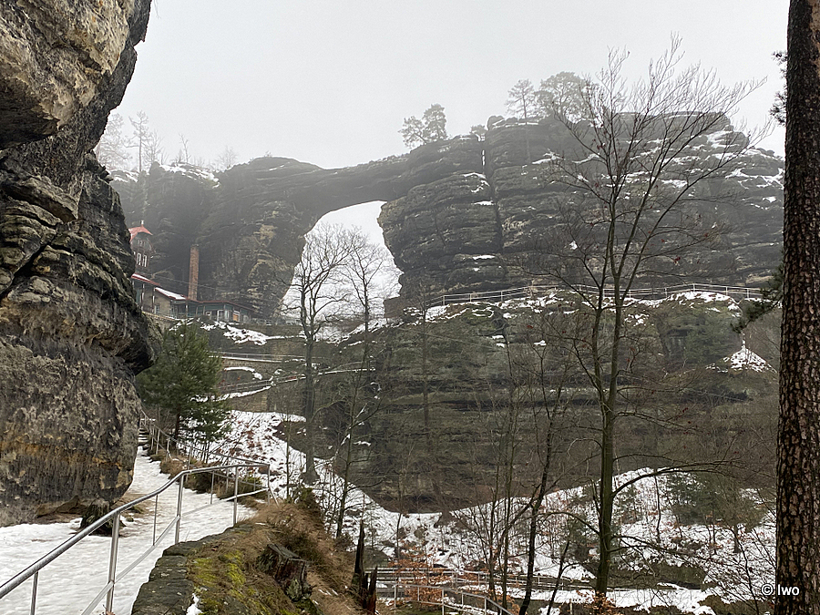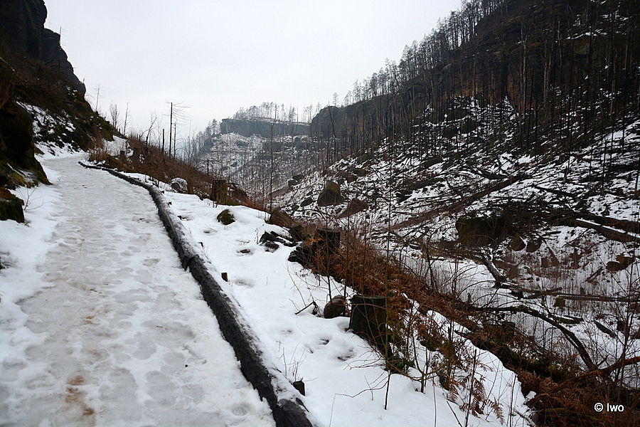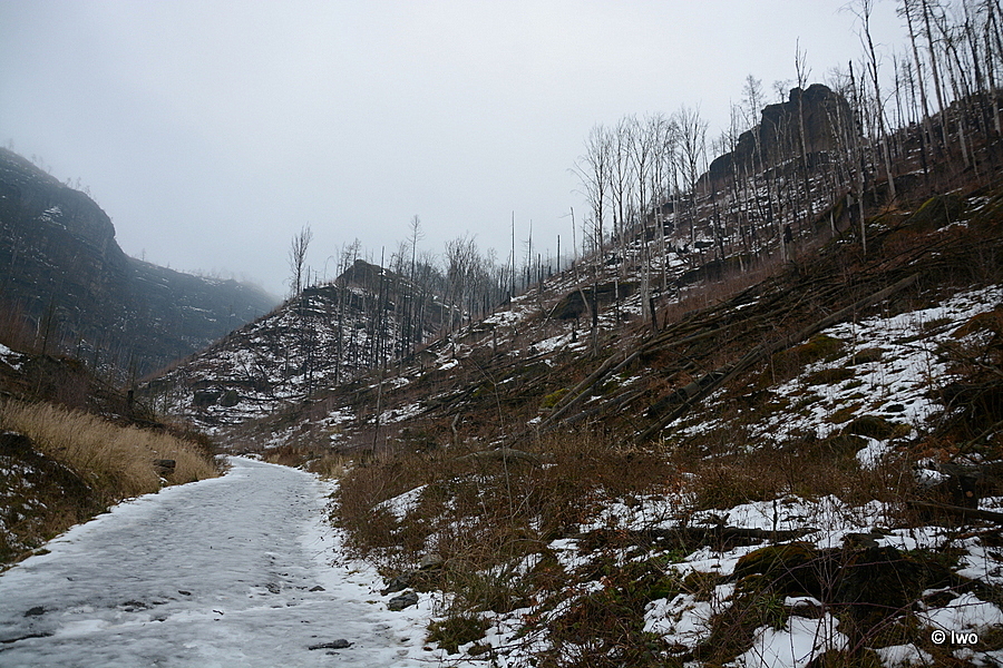 Závěrečný výstup po červené nahoru. Není se moc čím kochat, černobílá krajina optimistické pocity nevyvolává. Až kolem samotné brány zachovaný smíšený les. A hlavně nejistota – fakt otevřeno? Ať koukám jak koukám, znatelné jsou jen prastaré stopy a přes ně sem tam kopýtka nebo tlapky. Po lidské přítomnosti ani vidu. Nicméně když dorazím k cíli, branka pod restaurací i turnikety nahoře jsou vážně otevřeny. A nikde nikdo! Podle stavu schodišť na vyhlídky jsem tu ten den první. Lidi začnu potkávat až když scházím dolů na zpáteční autobus. A řeknu upřímně – nápad vydat se na tuhle túru v botaskách fakt nepovažuji za odvahu, ale za něco úplně jiného. V podstatě od Mezné bez nesmeků ani ránu. Cesta od Tří pramenů až k Pravčické bráně je pak jeden led. Nespoléhejte na to, že o pár kilometrů jinde jsou už silnice holé. Asi se nechcete vracet na nosítkách nebo vrtulníkem.