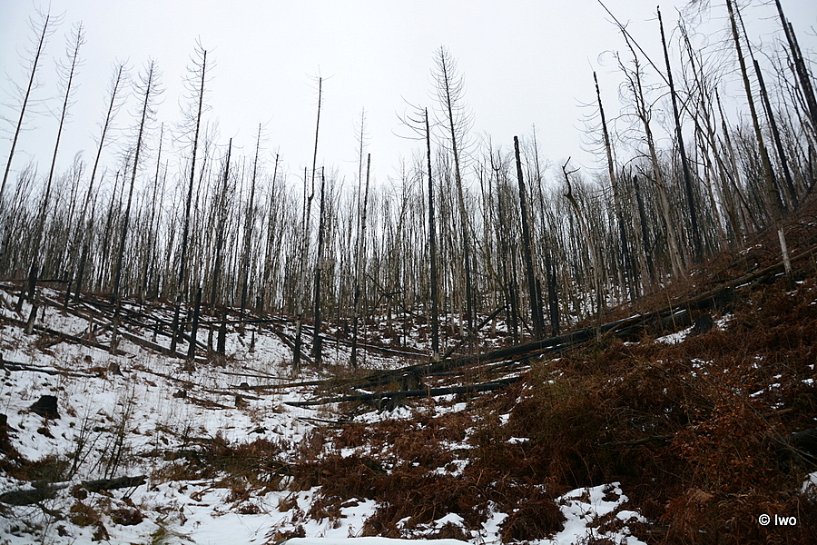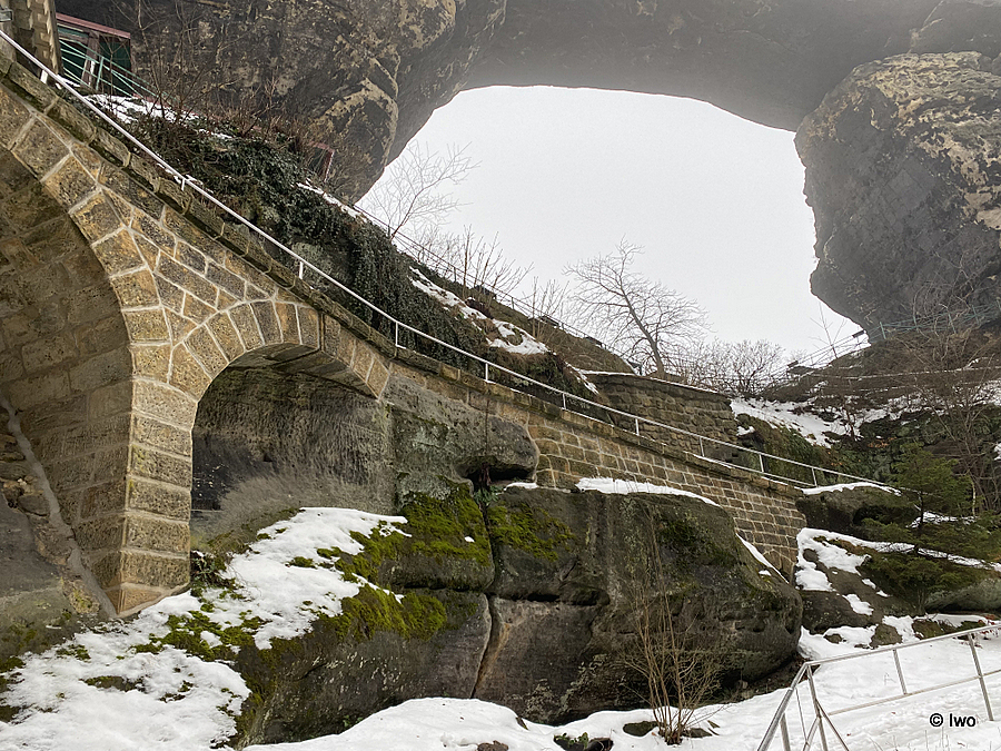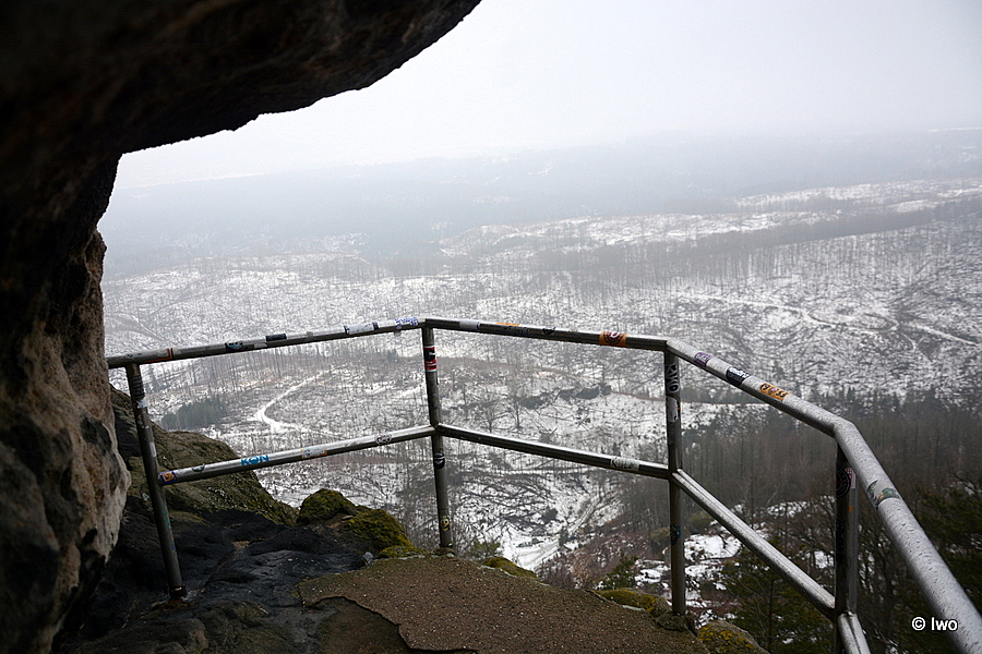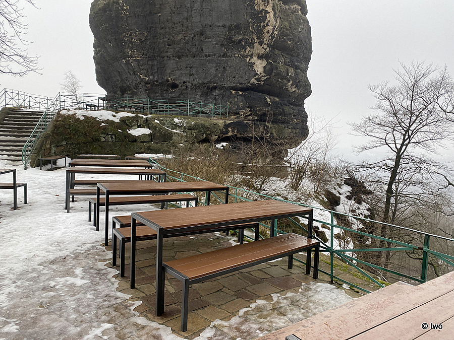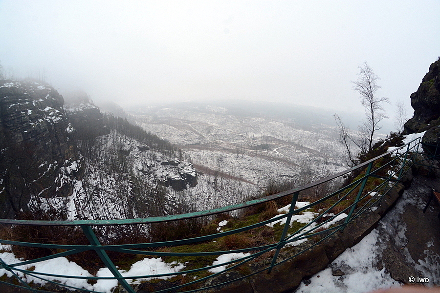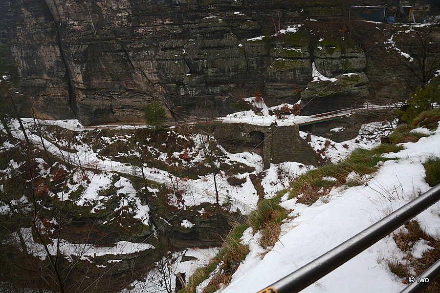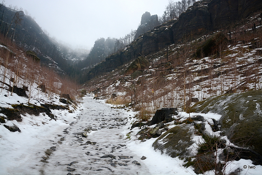 Závěrečný výstup po červené nahoru. Není se moc čím kochat, černobílá krajina optimistické pocity nevyvolává. Až kolem samotné brány zachovaný smíšený les. A hlavně nejistota – fakt otevřeno? Ať koukám jak koukám, znatelné jsou jen prastaré stopy a přes ně sem tam kopýtka nebo tlapky. Po lidské přítomnosti ani vidu. Nicméně když dorazím k cíli, branka pod restaurací i turnikety nahoře jsou vážně otevřeny. A nikde nikdo! Podle stavu schodišť na vyhlídky jsem tu ten den první. Lidi začnu potkávat až když scházím dolů na zpáteční autobus. A řeknu upřímně – nápad vydat se na tuhle túru v botaskách fakt nepovažuji za odvahu, ale za něco úplně jiného. V podstatě od Mezné bez nesmeků ani ránu. Cesta od Tří pramenů až k Pravčické bráně je pak jeden led. Nespoléhejte na to, že o pár kilometrů jinde jsou už silnice holé. Asi se nechcete vracet na nosítkách nebo vrtulníkem.