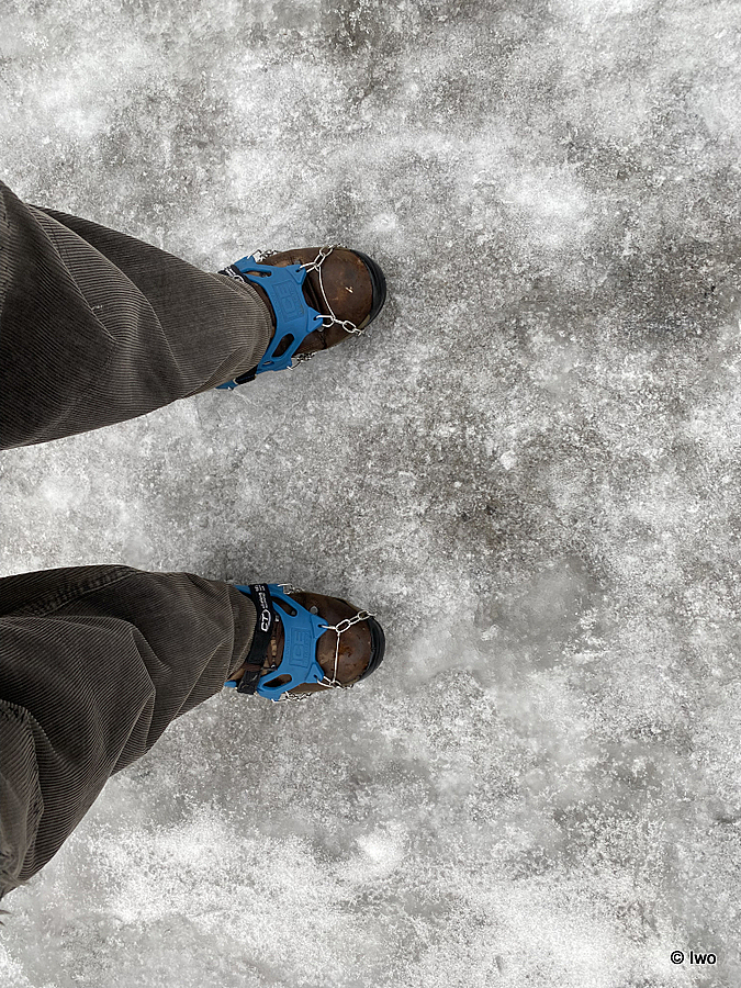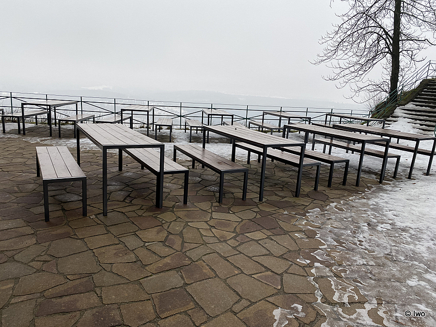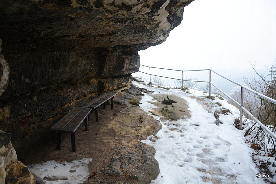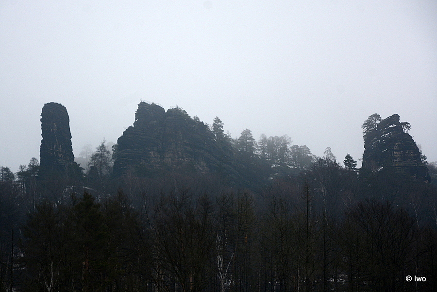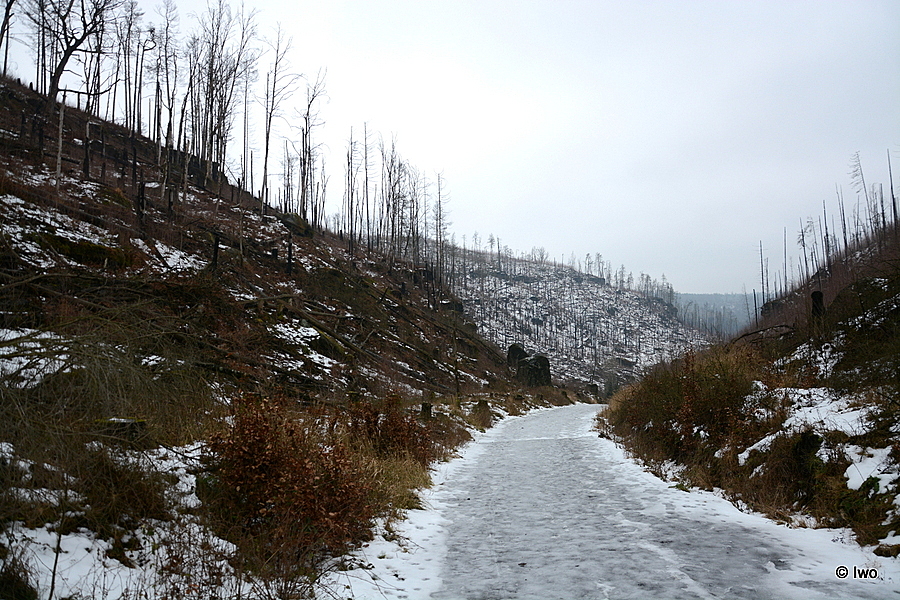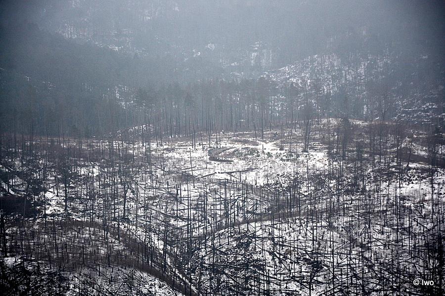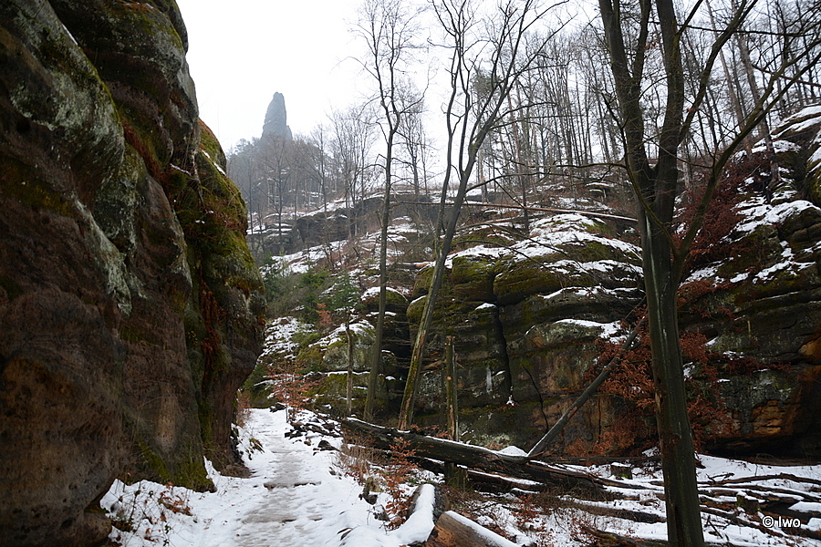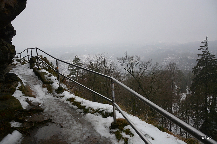 Závěrečný výstup po červené nahoru. Není se moc čím kochat, černobílá krajina optimistické pocity nevyvolává. Až kolem samotné brány zachovaný smíšený les. A hlavně nejistota – fakt otevřeno? Ať koukám jak koukám, znatelné jsou jen prastaré stopy a přes ně sem tam kopýtka nebo tlapky. Po lidské přítomnosti ani vidu. Nicméně když dorazím k cíli, branka pod restaurací i turnikety nahoře jsou vážně otevřeny. A nikde nikdo! Podle stavu schodišť na vyhlídky jsem tu ten den první. Lidi začnu potkávat až když scházím dolů na zpáteční autobus. A řeknu upřímně – nápad vydat se na tuhle túru v botaskách fakt nepovažuji za odvahu, ale za něco úplně jiného. V podstatě od Mezné bez nesmeků ani ránu. Cesta od Tří pramenů až k Pravčické bráně je pak jeden led. Nespoléhejte na to, že o pár kilometrů jinde jsou už silnice holé. Asi se nechcete vracet na nosítkách nebo vrtulníkem.
