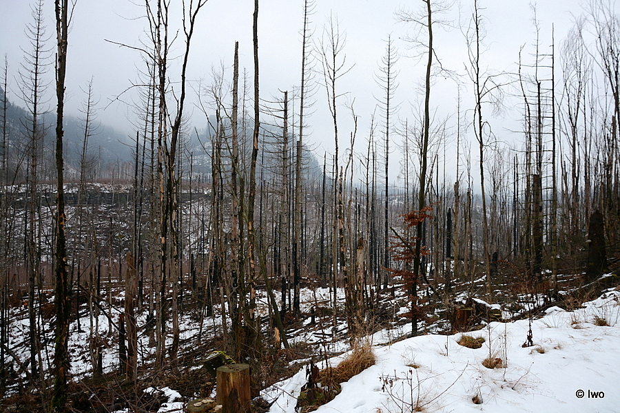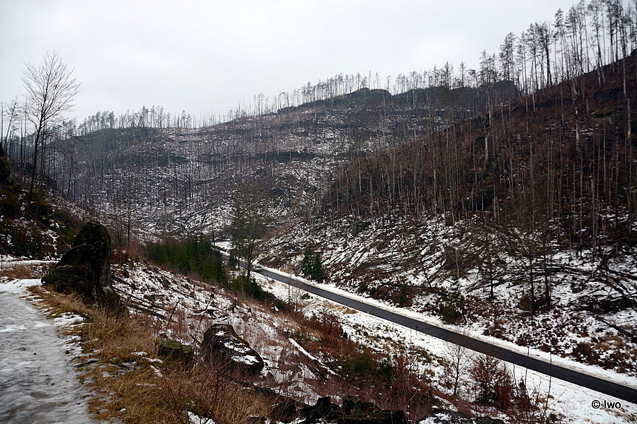 Taktování spojů mimo sezónu je řídké, takže nechat se doopravit až ke Třem pramenům je sice pohodlné, ale trochu mimo, protože co pak s načatým večerem? Času plno, proto je lepší naplánovat si delší procházku. Moc možností ovšem není. Gabrielina stezka je zavřená a čert ví, jestli se ještě vůbec někdy otevře. Zbývá tak jen výšlap z Hřenska nebo Mlýnská cesta. Nasedám na první jízdu z Krásné Lípy (jede nás pět a půl) a vystupuji na Mezní Louce. Kolem záchytného parkoviště po silničce na Meznou. Alej, pomník Velké války, svatý Václav, křížek, nová boží muka. Pak už samotná Mlýnská cesta – pomník Ondřeje Hese a především Fénix. Za celou trasu až ke Třem pramenům potkám v lese (tedy v tom, co z něho zbylo) jen a jen auto správy národního parku, jinak nikde nikdo…