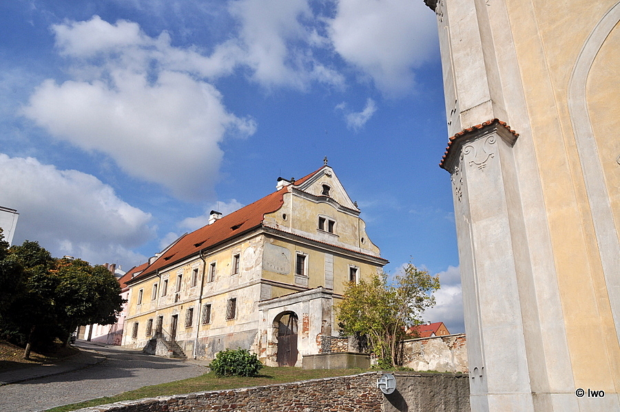 Městský dům – fara čp. 97. Jednopatrový, do svahu vestavěný dům o 2×7 ok. osách, krytý sedlovou střechou /tašky/. Vstupní /západní/ průčelí člení mělký střední tříosý risalit, zdůrazněný stejně jako nároží lisénami, a profilovaná kordonová a hlav. římsa. Přízemí s vysokým, terén vyrovnávajícím soklem má okna v pravoúhlých rámech, klenáky s ušima; původně tepané mříže. V ose risalitu umístěný portál má stejně řešená ostění; v klenáku je vložena oválná kartuš. K portálu vede dvouramenné schodiště s železným empírovým zábradlím. Okna 2. p. jsou stejná, v parapetech mají vpadlé výplně s rosetami. Na jižním nároží jsou ve štukovém rámu namalovány sluneční hodiny, které přechází i na jižní boční fasádu. Ta je členěna obdobně, lisény jsou však bosovány a okna přízemí nemají římsy. Nad hlavní římsou je umístěn volutový štít, ukončený strmým trojúhelným tympanonem s vloženým kaulovým oknem. Plochu štítu člení lisény, nesoucí profilovanou římsu, v ose vydutou do segmentového štítu; ve štítě sdružené okno. Stejně řešený štít je i nad severní fasádou. Interiér se střední chodbou, sklenutou křížovými klenbami, je v přízemí klenut lunetovými klenbami. V patře jsou rovné malované stropy. Při jihozáp. nároží budovy je zděná brána do dvora, krytá rovnou prejzovou stříškou. Půlkruhový vjezd je vložen mezi 2 pilastry.