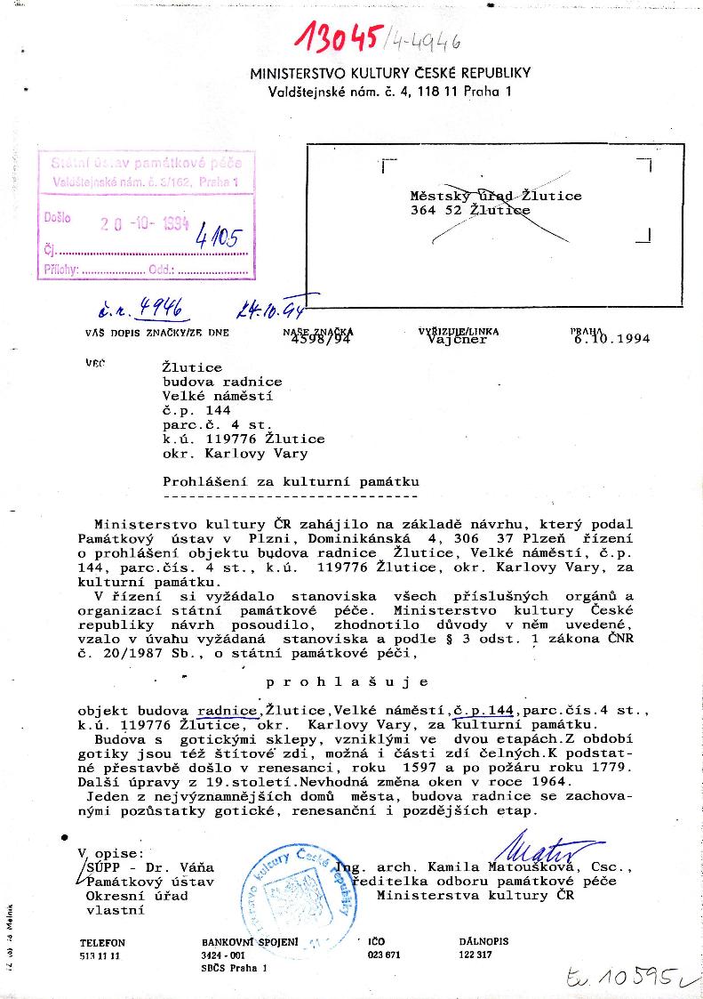 Dopis okresního soudu Místní správní komisi ve Žluticích ze dne 22. března 1946 se týkal nutnosti opravy vnějších fasád budovy radnice čp. 144 a sousední budovy soudu čp. 1. Podle dopisu byla tehdy budova radnice zvenčí značně sešlá, takže je jednou z nejnevzhlednějších budov na náměstí, ačkoliv by jako veřejná budova měla být ozdobou města a důstojně reprezentovat obec i stát. Obec se však tehdy nacházela ve složité finanční situaci, soud proto nabídl zdarma pracovní síly potřebné k provedení oprav fasády. Podle návrhu měli zednické, tesařské, elektrikářské i pokrývačské práce vykonat bez náhrady v rámci veřejných prací vyšetřovanci a vězni za předpokladu, že obec převezme, „jak ostatně k tomu jest povinna dle evidentních závazků ohledně budovy své používané pro úřad MSK”, finanční náklad na hotové výlohy a ostatní práce spojené s dozorem stavitele. Zároveň zazněl požadavek, aby budova radnice čp. 144 byla opravována zároveň se sousední budovou soud čp. 1, jelikož ty tvoří architektonicky jeden celek a je nutno zamezit tomu, aby byl porušen celkový ráz.