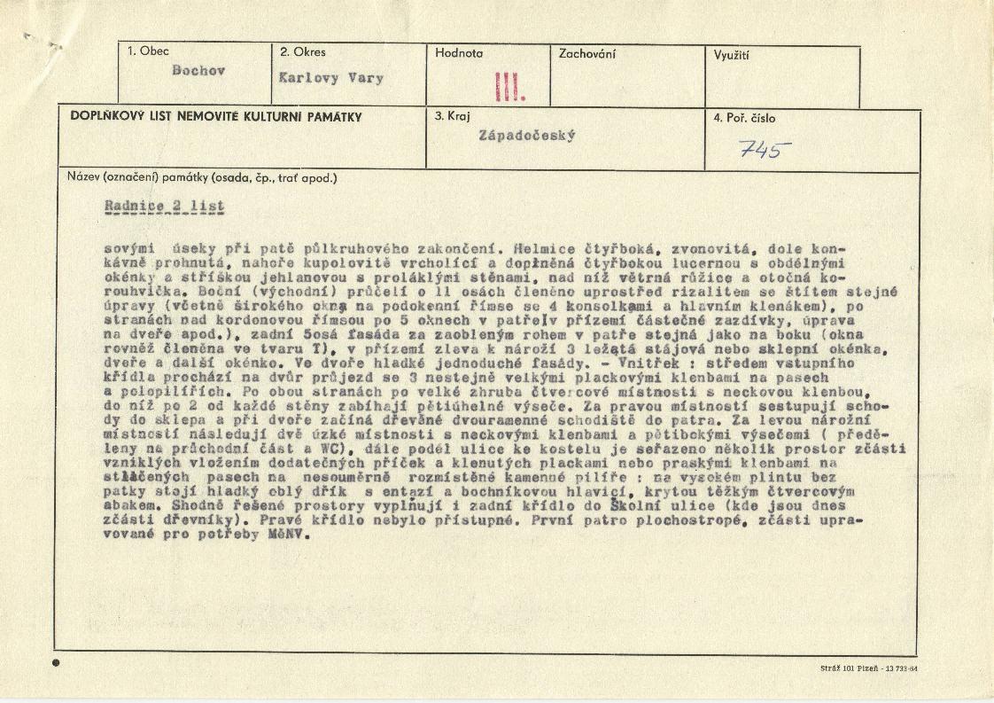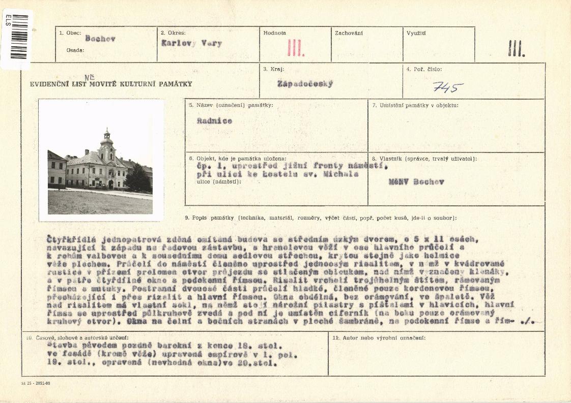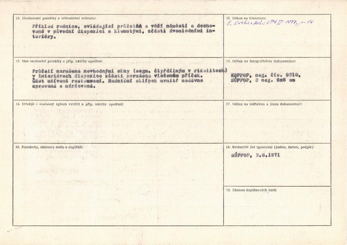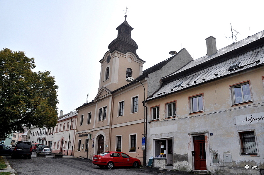 Radnice – původní budova radnice byla zakoupena městem od majitele panství Jindřicha IV. z Plavna v roce 1533.19 V berní fassi josefinského katastru z roku 1787 je označena číslem popisným 1.20 Kvůli špatnému stavu budovy bylo přikročeno k její novostavbě na stejném místě. Základní kámen byl položen 15. května 1818 a stavba, financovaná ze zvláštních zdrojů mimo obecní fond, probíhala do roku 1820.21 V protokolu stavebních parcel z roku 1841 je radnice vedena stále pod č.p. 1. Z mapy stabilního katastru je patrné, že se jednalo o nárožní budovu, nalézající se v jižní části náměstí, kolem jejíhož východního boku, vedla jihovýchodním směrem ke kostelu sv. Archanděla Michaela Kostelní ulice (něm. Kirchengasse).22 Dne 19. listopadu 1820 město zakoupilo sousední dům č.p. 2, přiléhající k domu č.p. 1 na jeho západní straně, následně jej přestavělo a od roku 1834 jej začalo využívat rovněž pro potřeby radnice – v přízemí se nalézaly kanceláře a byt policejního sluhy, v prvním patře byl byt zkoušeného rady.23 Na konci roku 1848 se město rozhodlo budovu č.p. 1 poskytnout státu, aby zde byl umístěn okresní soud. Celý dům č.p. 1 ovšem zůstal nadále v majetku města, jeho užívací práva však zde byla omezena pouze na sklep, 2 přízemní místnosti a zasedací sál. Tyto prostory byly přístupné z bočního vchodu z Kostelní ulice, průčelní vchod z náměstí sloužil okresnímu soudu.24 Inventáře majetku města ze 20. a 30. let uvádějí již jako sídlo purkmistrovského (městského) úřadu dům č.p. 2, přičemž evidují i jeho vnitřní zařízení.
