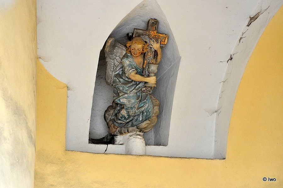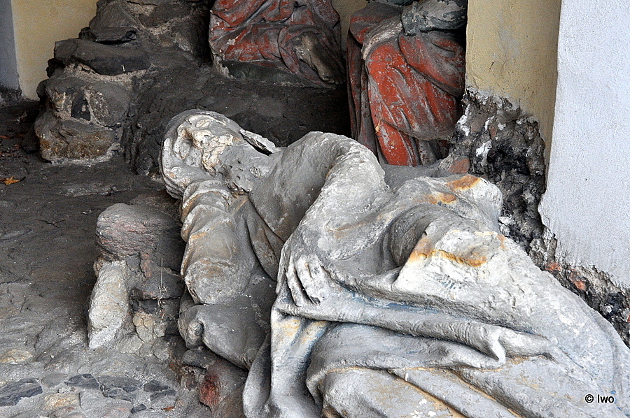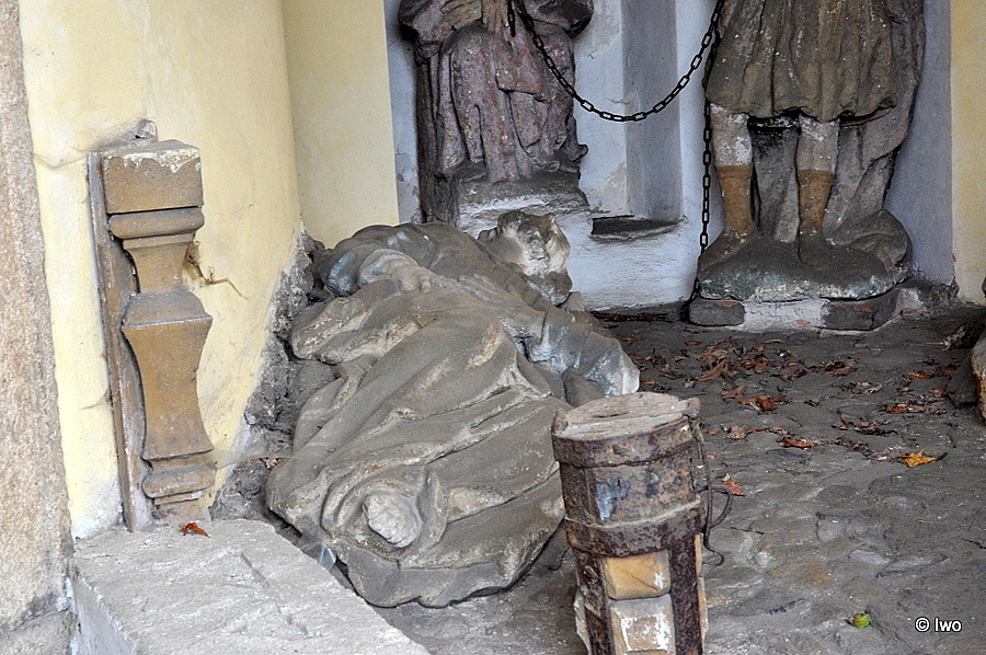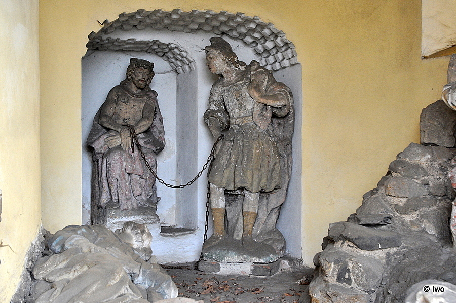 Překvapivě se jedná o informaci poněkud nepřesnou a neúplnou. Ani slovo o tom, odkud sochy jsou (úplně to nevypadá, že celý komplet je tu původní) a kdo je má na svědomí. Vzadu ve členěném výklenku sedí Kristus spoutaný řetězem (zrovna moc trpitelský výraz ale nemá) – ovšem střeží ho biřic. Jeden. Takže množné číslo není na místě. Nad výklenkem hluboká špičatá nika, v ní anděl s kalichem hořkosti a křížem. Ten patří ke zbytku soch – k výjevu z Getsemanské zahrady. Ano, jsou tu spící apoštolové, ale s nimi také modlící se Kristus na kamenném pahorku. Pod polychromií není rozeznat, zda jsou sochy vskutku dřevěné – ale dva ležící apoštolové (u vstupu a vlevo před výklenkem) dřevěně opravdu nevypadají a po polychromii ani stopy (patří vůbec do stejného souboru?).
