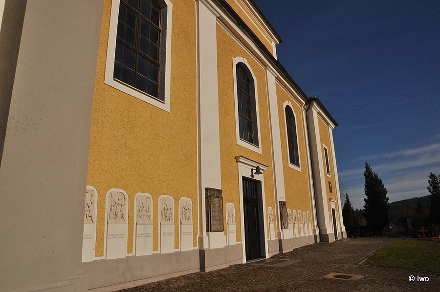 Po vnější straně kostela vede křížová cesta z roku 1896.