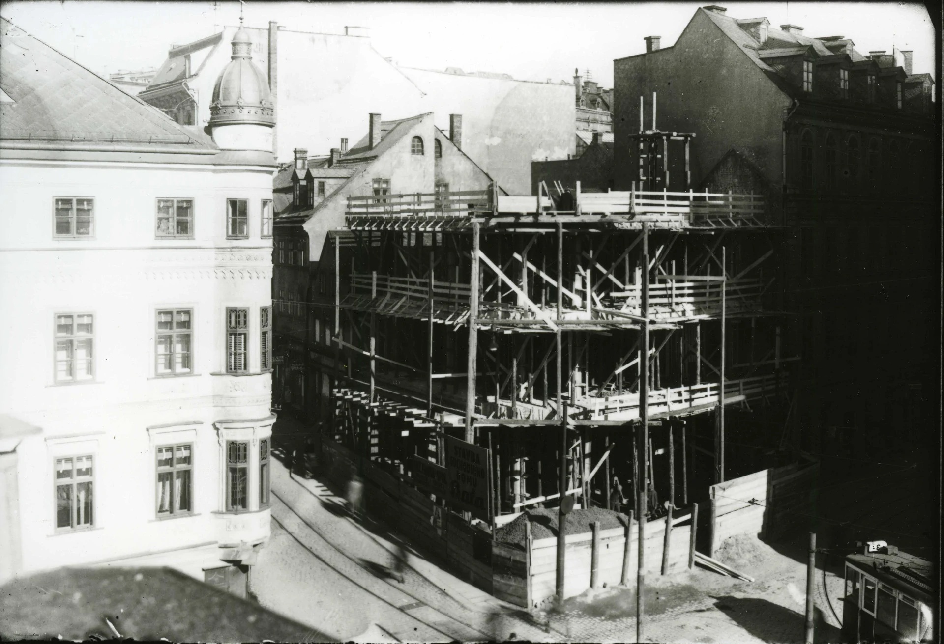 Devítipodlažní budova s železobetonovou nosnou konstrukcí byla postavena na místě původní klasicistní zástavby, ve které původně bylo železářství Jana Mráze.