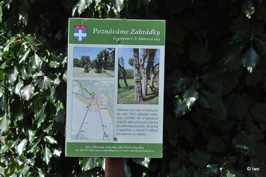 Mezi hospodářskou budovou před zámkem Zahrádky a vstupem do přilehlého zámeckého parku se nachází habrová alej.