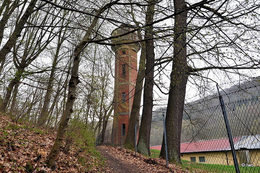 Na továrním objektem v zákrutu řeky Ploučnice na trase zelené turistické značky z Františkova nad Ploučnicí ke hradu Ostrý stojí vodárenská věž.
