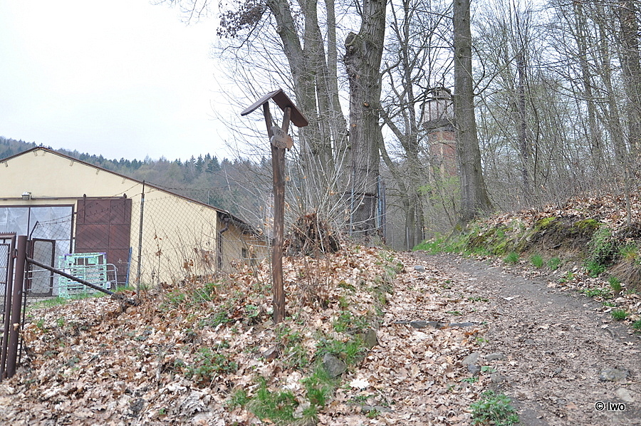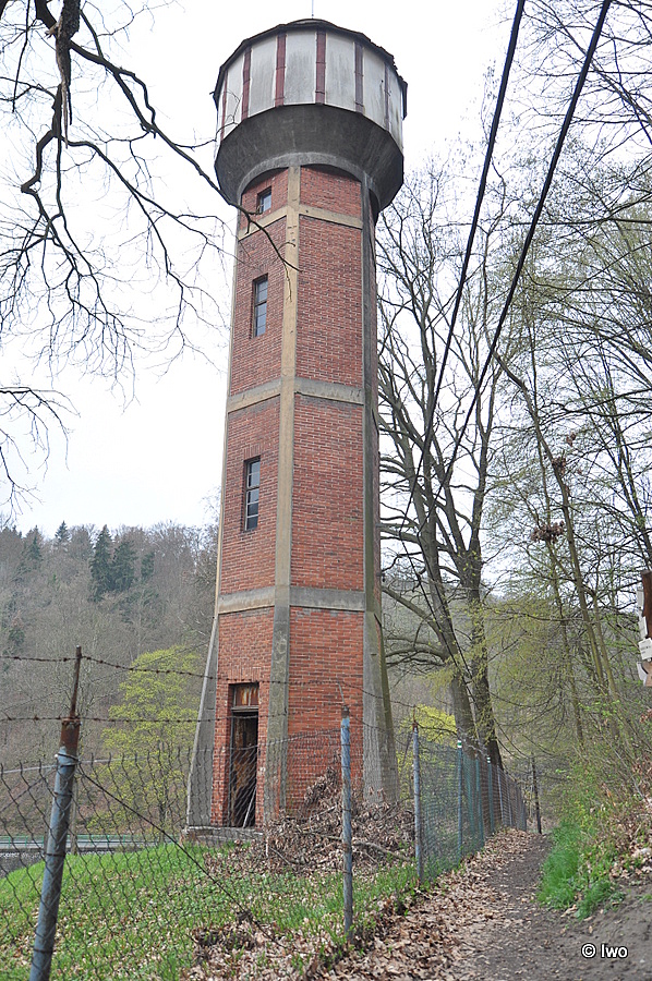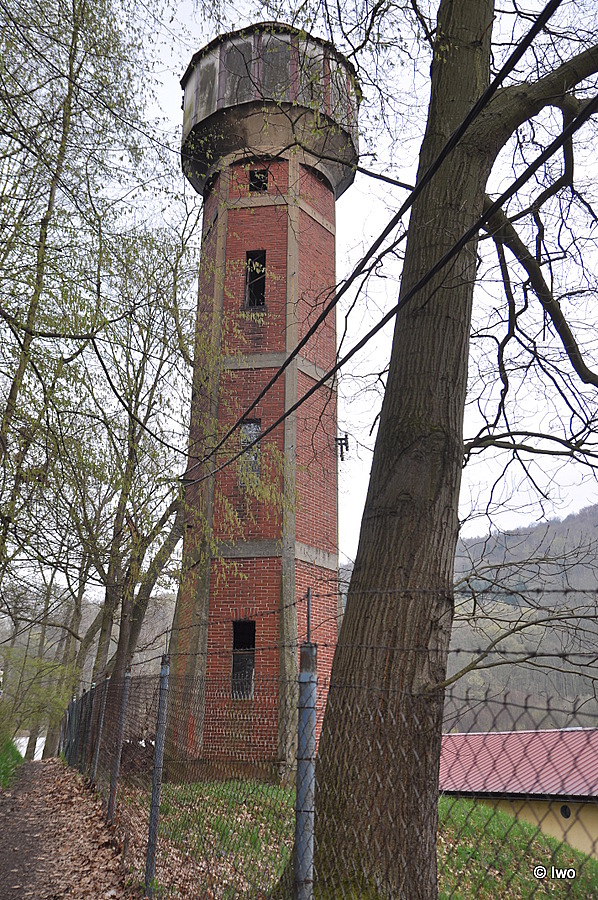 Na továrním objektem v zákrutu řeky Ploučnice na trase zelené turistické značky z Františkova nad Ploučnicí ke hradu Ostrý stojí vodárenská věž.