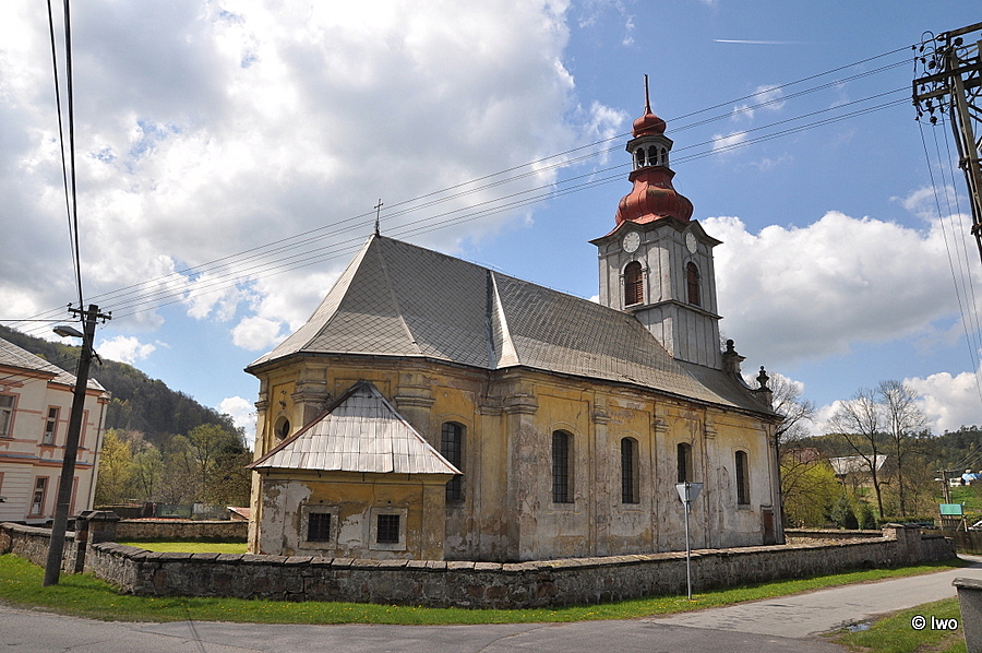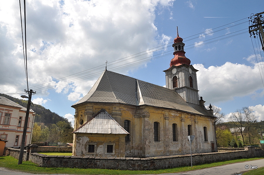 Kostel je jednolodní stavba barokního slohu s 25 metrů vysokou věží v západním průčelí, postavená uprostřed obce. Zajímavý a cenný je, či spíše byl rokokový a klasicistní interiér (je zčásti vykradený), byly zde postaveny tři oltáře, prostřední hlavní s otáčecím svatostánkem. Křtitelnice je z 18. století.