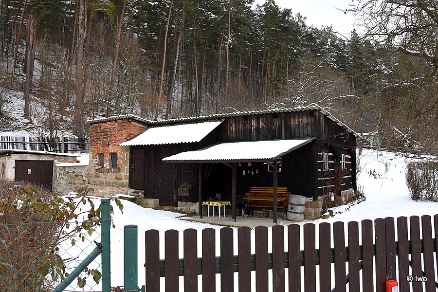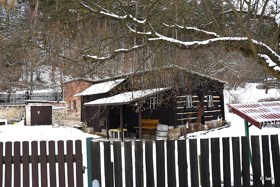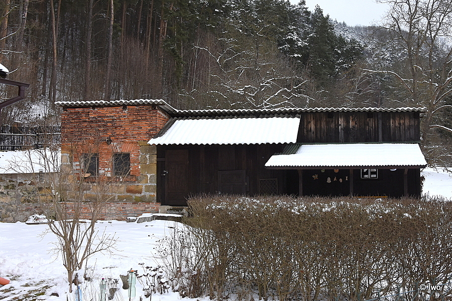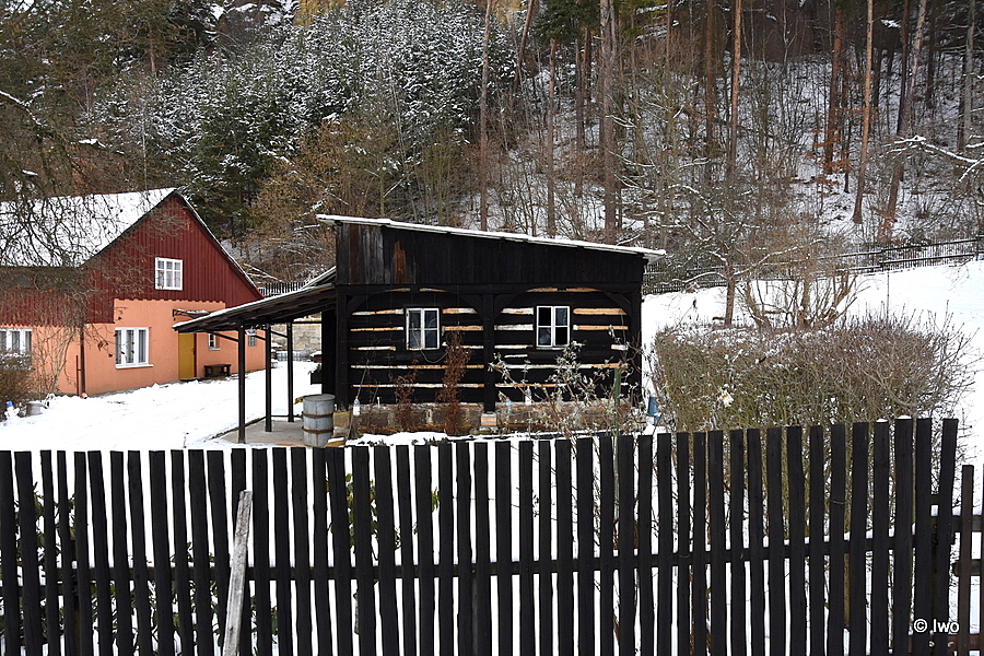 A víc ani ťuk… Proč je tenhle docela zprzněný zbytek podstávkového domu chráněný, kdo ví. Jakž takž stojí za pohled stěna, která nejspíš byla štítová, s dochovanou podstávkou. Místo patra je šikmina, zakrytá vlnitým plechem, a do zahrady je ke stavbě připlácnutá veranda. Moc to nechápu…