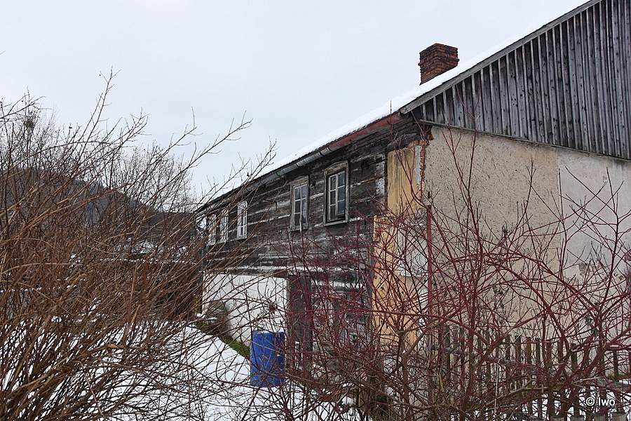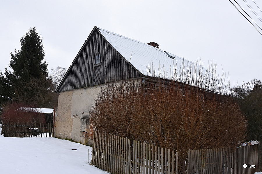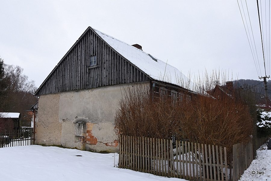 Obdélné patrové stavení z 19. stol. roubené se sedlovou střechou, krytou eternitem. Štít ozdobně sesazované lišty, vyřezávané prkno, 3 vertikální lišty, parapety pod 2 okny. Průčelí 5 okenních os (malá okénka). Podélná stěna 3 okenní osy v pravé části. Levá polovina podél. stěny vystupuje, v patře 4 okenní osy, v přízemí 2 okna. Zadní průčelí obezděno, štít svisle bedněn. Vlevo vzadu bedněná stodola. Stropy uvnitř místností trámové.