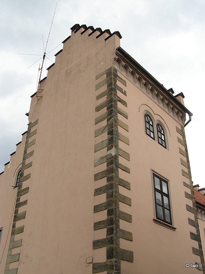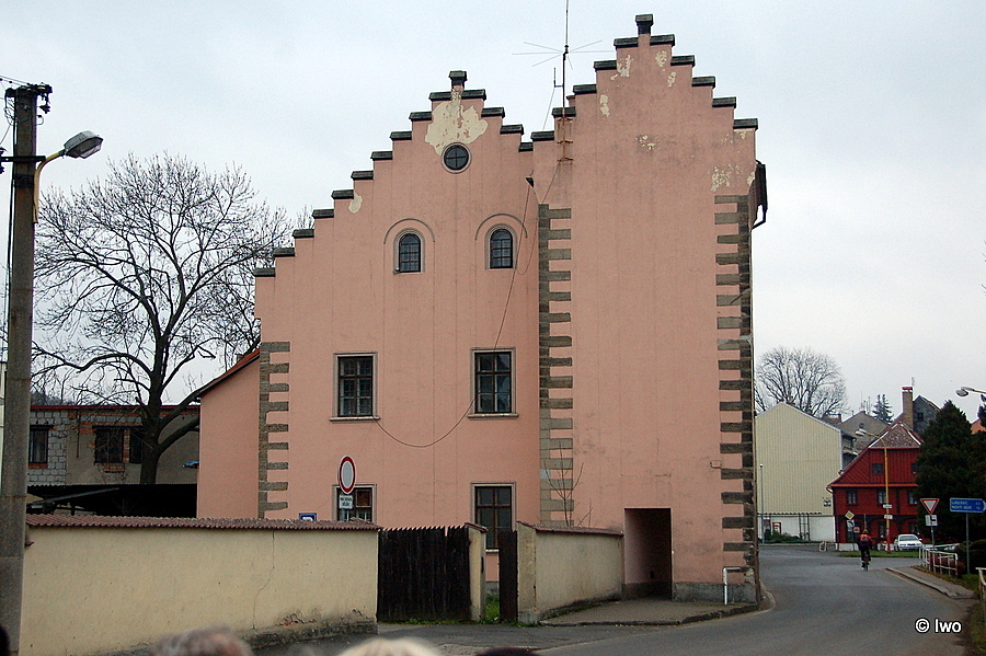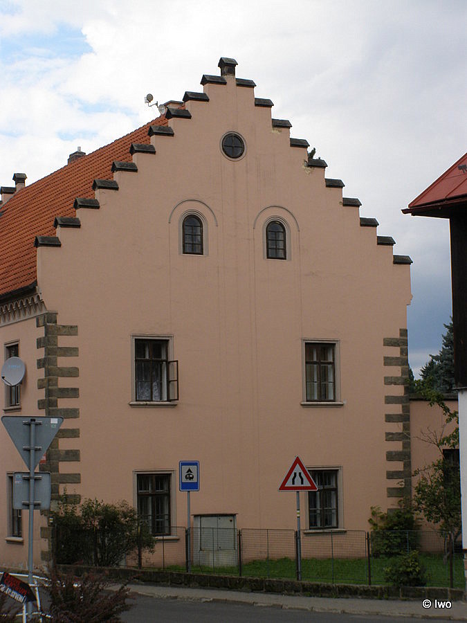 Zděný omítaný obdélný patrový dům s dvoupatrovým věžovým risalitem v JZ nároží a se sedlovou střechou krytou břidlicí. Podélné průčelí 5 okenních os, 1. okenní osu zleva tvoří nárožní risalit. Ve 3. ose zleva pravoúhlý portál. Nároží armována. Pod okapní římsou obloučkový plastický vlys. Pravá boční stěna 2 okenní osy, stupňovitý štít rovněž se 2 okny. Levá boční stěna vlevo 2 okenní osy pod 3/4 stupňovitého štítu, v pravé části nárožní risalit převýšená 1×1 okenní osa. Okna pravoúhlá, ve štítě se segmentovým zaklenutím. Zadní podélná stěna obdobná průčelí, bez risalitu. Z roku 1521, obnoven 1691.
