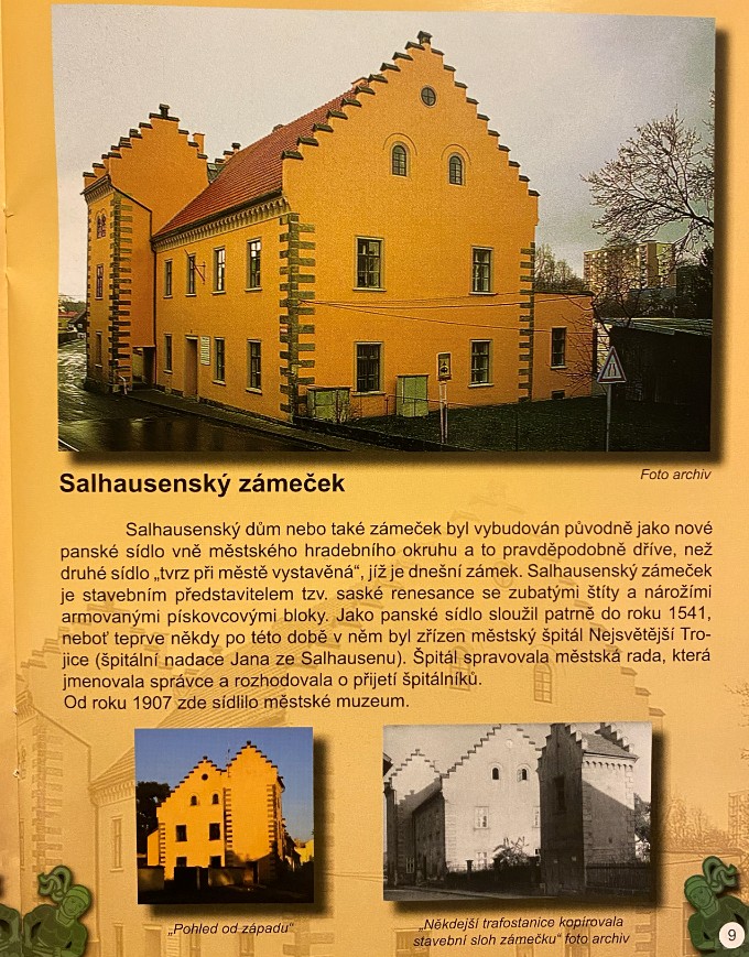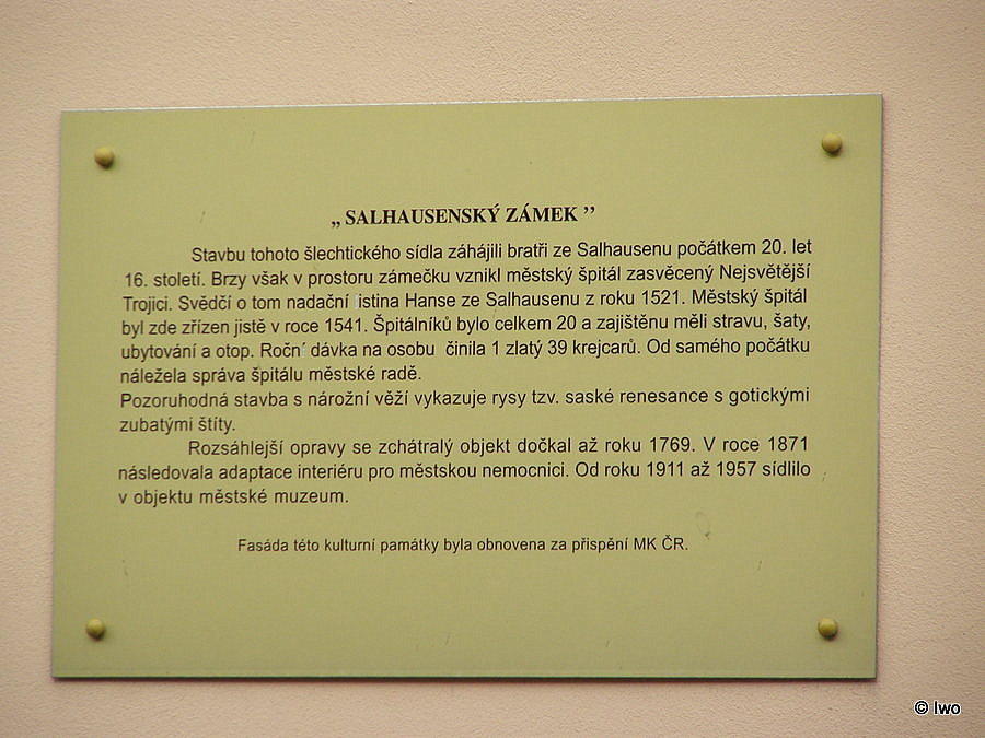 Patrový obdélný objekt postavený ve 20. letech 16. st. jako sídlo Salhausenů. Po přesunutí jejich sídla do zámku byl objekt využíván jako špitál Nejsvětější Trojice. Objekt prošel úpravou v r. 1769, ke které se zachovaly plány Jana Jiřího Kačinky.