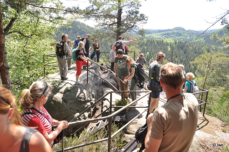 Jedna z vyhlídek je přímo na plošině pod skalní bránou, další dvě (unten, oben) jsou nad skalami, přístupné po schodech (místy takřka žebřících). Z té spodní je výhled vcelku omezený, horní nabízí podstatně lepší rozhled.