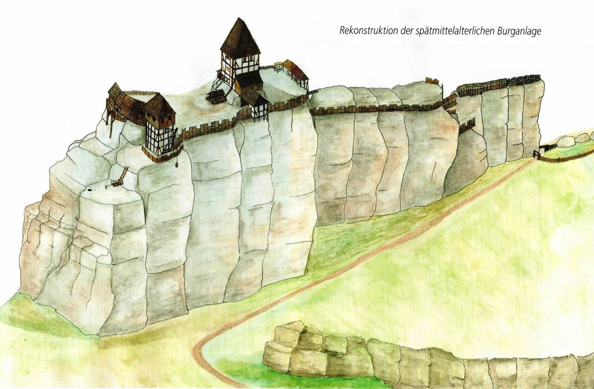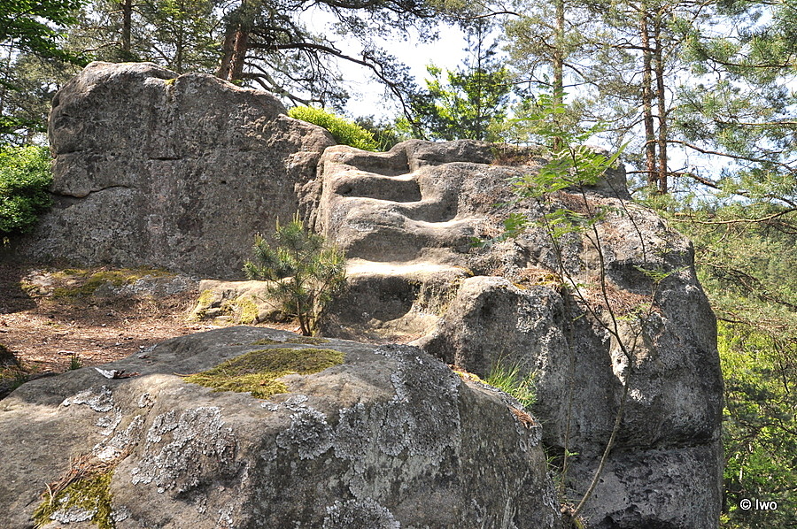 Náročný výstup po schodech a žebřících na skalní plato na vrcholu pískovců, na nichž zůstaly jen nepatrné stopy, že tu snad kdysi cosi bývalo (pár zádlabů, schůdky, nádrž (či skladovací prostor) a záhadná rytina. Kupodivu se mu věnuje i česká wiki: