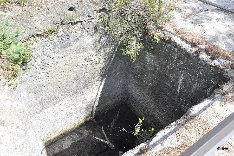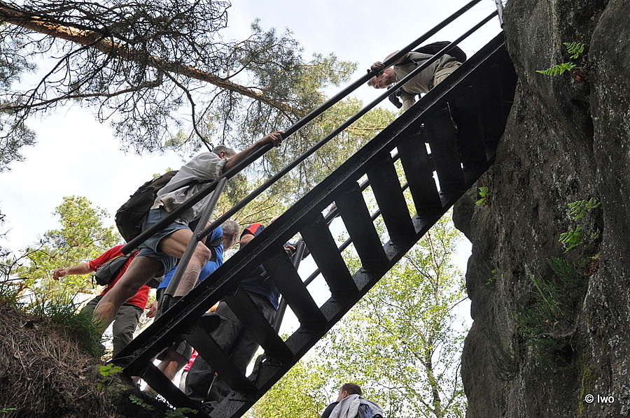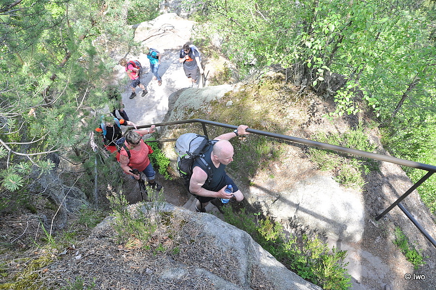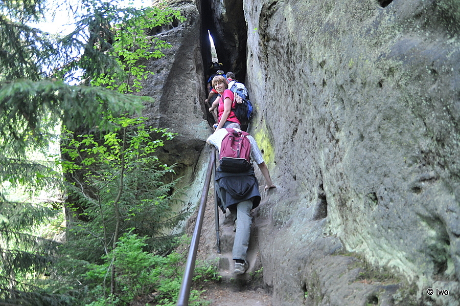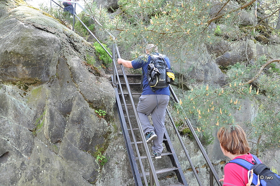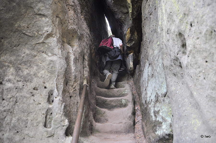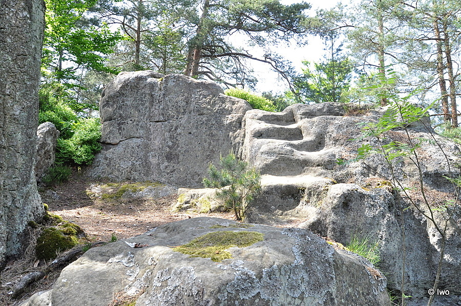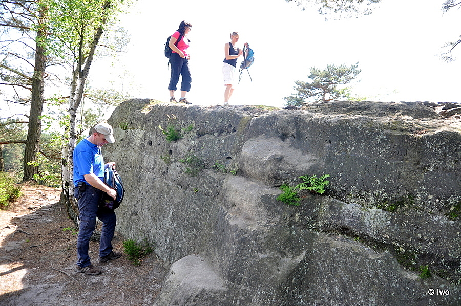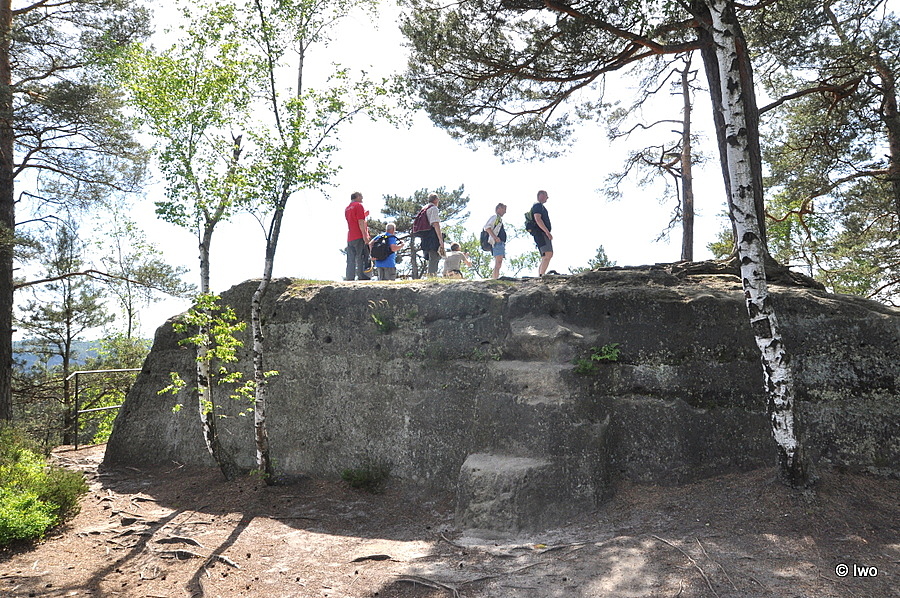 Náročný výstup po schodech a žebřících na skalní plato na vrcholu pískovců, na nichž zůstaly jen nepatrné stopy, že tu snad kdysi cosi bývalo (pár zádlabů, schůdky, nádrž (či skladovací prostor) a záhadná rytina. Kupodivu se mu věnuje i česká wiki: