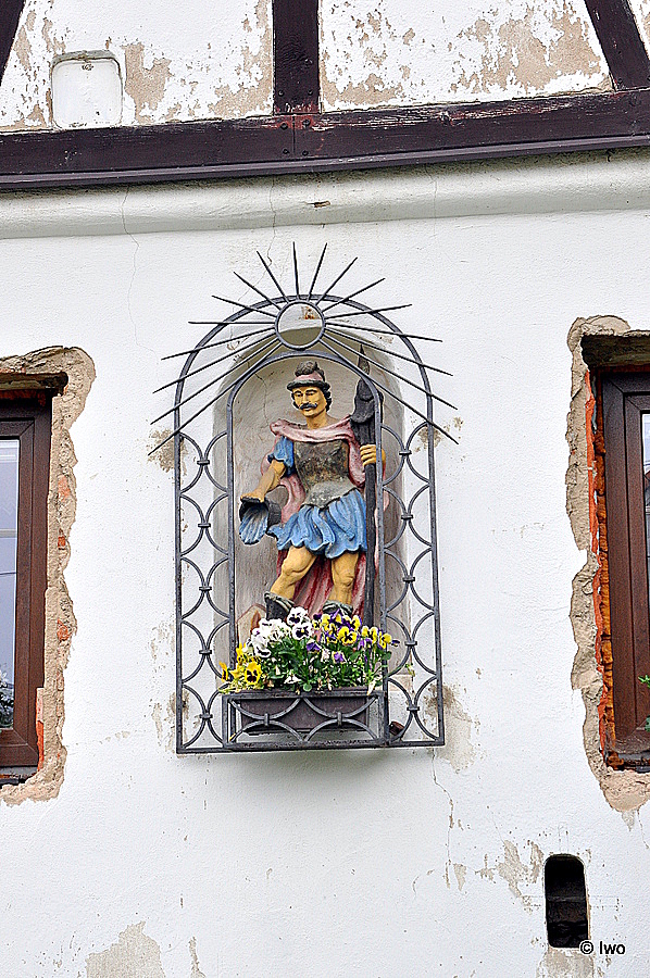 V přízemí štítové stěny mezi okny nika s polychromovanou sochou svatého Floriána. Klasické zobrazení – v šatu římského vojáka s helmicí na hlavě, pravou rukou drží vědro, z něhož vytéká voda na hořící dům u světcových nohou. Levou rukou drží u svého boku žerď praporce. Kolem niky kovaná mříž, shodná s mříží na nice se sochou svaté Anny.