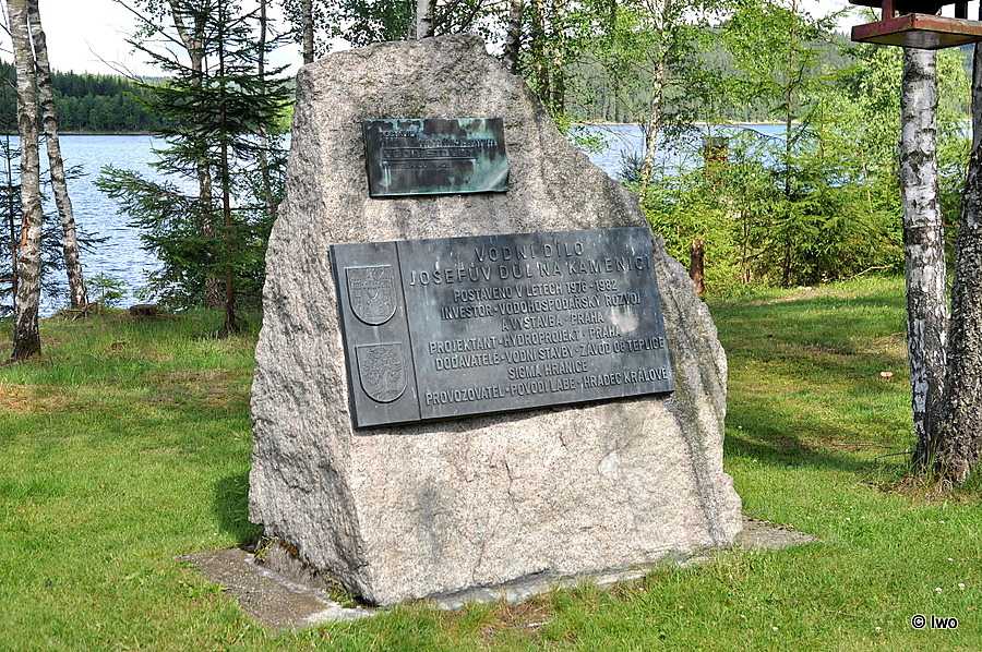 U hráze vodního díla Josefův Důl stojí kámen s pamětní deskou výstavby místní přehrady.