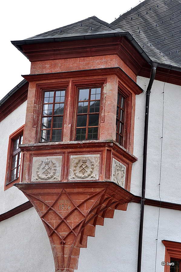 Nárožní arkýř je podepřen jehlancovou konstrukcí s lípanými kružbami z protínaných prutů, svedenými dole do dvou konzol. Na poprsni jsou vytesány dva znaky mincovny se skříženými kladívky ve vavřínovém věnci a letopočet dokončení stavby anno 1536. Arkýř byl původně věžovitý, měl jehlancovou stříšku, která při rekonstrukci nebyla obnovena. Arkýř je dobově příznačný pro stavební huti pozdní gotiky, například huť Benedikta Rejta. Kamenný vstupní portál je již renesanční, vede do síně s průjezdem na arkádová nádvoří, kde byly původní provozy mincovny a sklady vyrubané stříbrné rudy. Prostory mají valené klenby a jsou zčásti podsklepené.