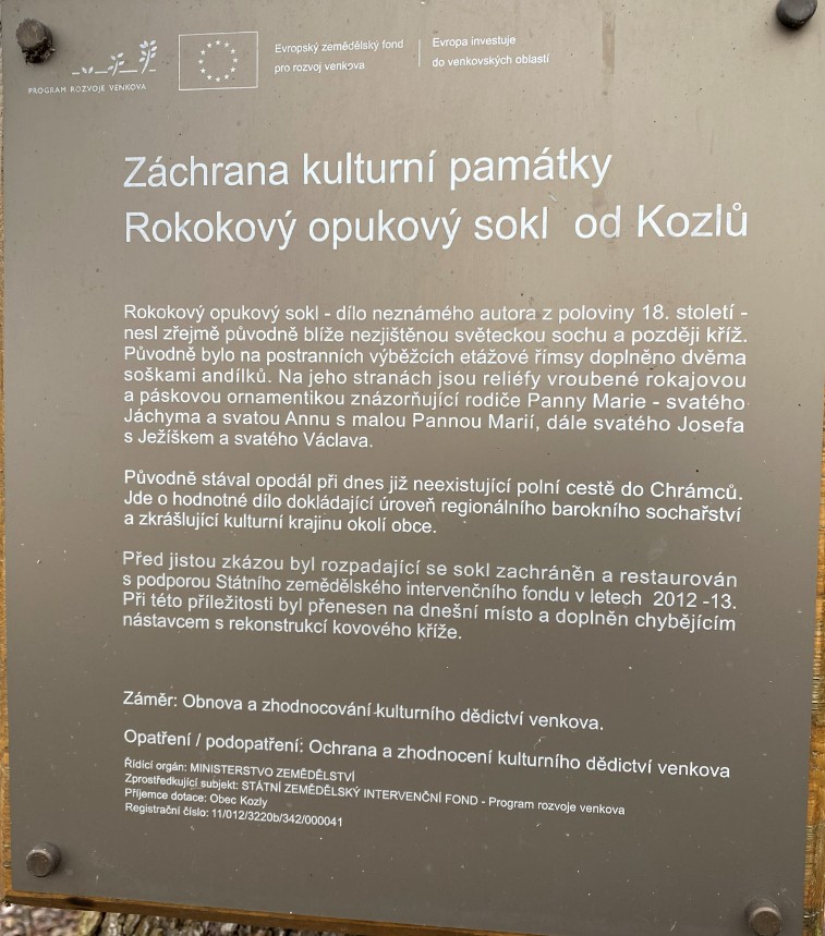 Přímo u kříže umístěná informační tabulka je překvapivě jediným zdrojem informací. Nejde o kulturní památku, Google odkazuje na nejrůznější jiné obce téhož jména po republice, obecní web mlčí a na záchytný bod o provedené rekonstrukci jeden jediný odkaz: