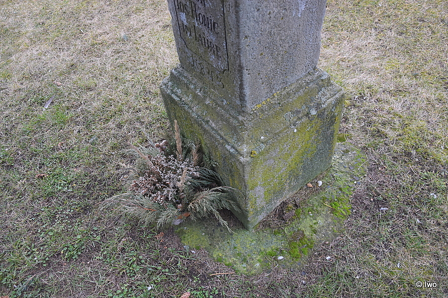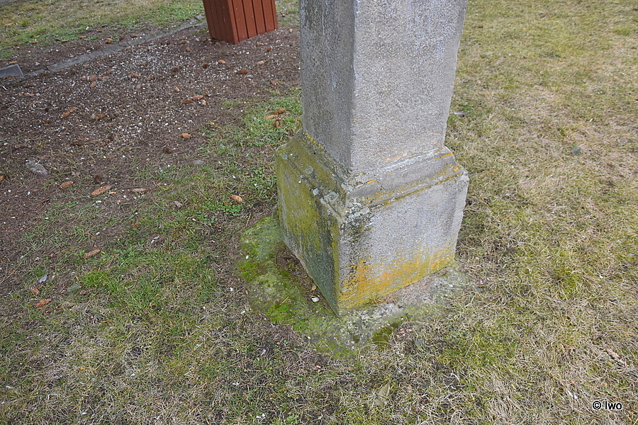 Na v terénu takřka zmizelé základně stojí spodní širší stupeň soklu obdélného půdorysu s hladkými stěnami (na levé straně výše zmíněná tabulka o financování opravy Ministerstvem pro místní rozvoj). Rámovanou projmutou širokou lištou přechází do vlastního těla, vysokého kvádru. Na čelní straně v obdélném poli s vykrojenými rohy nápis: