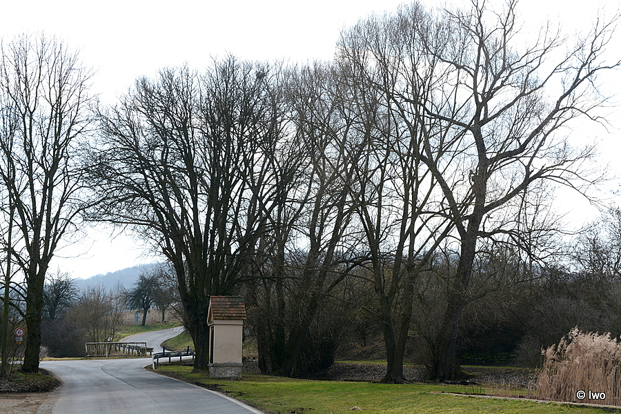 Vlevo od kaple mohutný strom, lze předpokládat, že kdysi byl nějaký i vpravo.