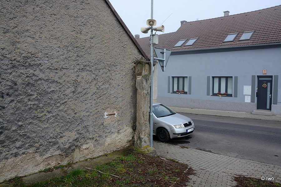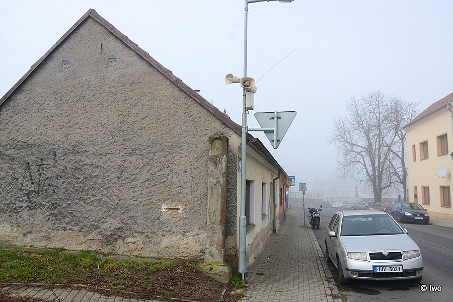 Nepřipravení kolemjdoucí si možná ošuntělých muk ani nevšimnou, ze strany k silnici kryty kovovým sloupem pro dopravní značku a místní rozhlas svou barvou splývají s omítkou stěny, u níž stojí. Nejde o chráněnou památku, Google nenajde nic.