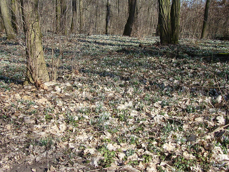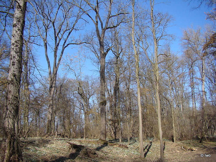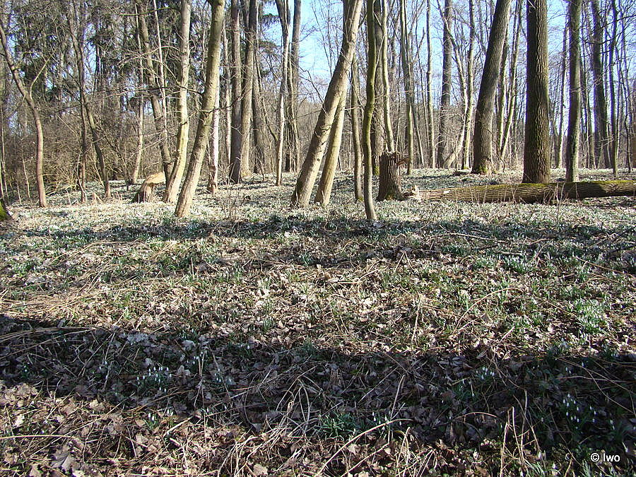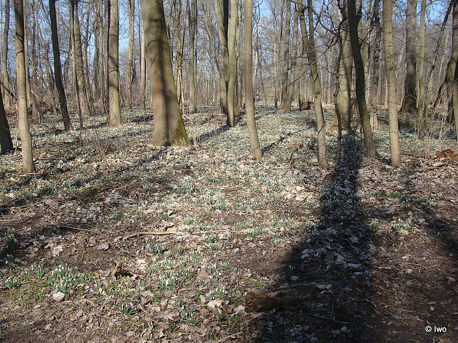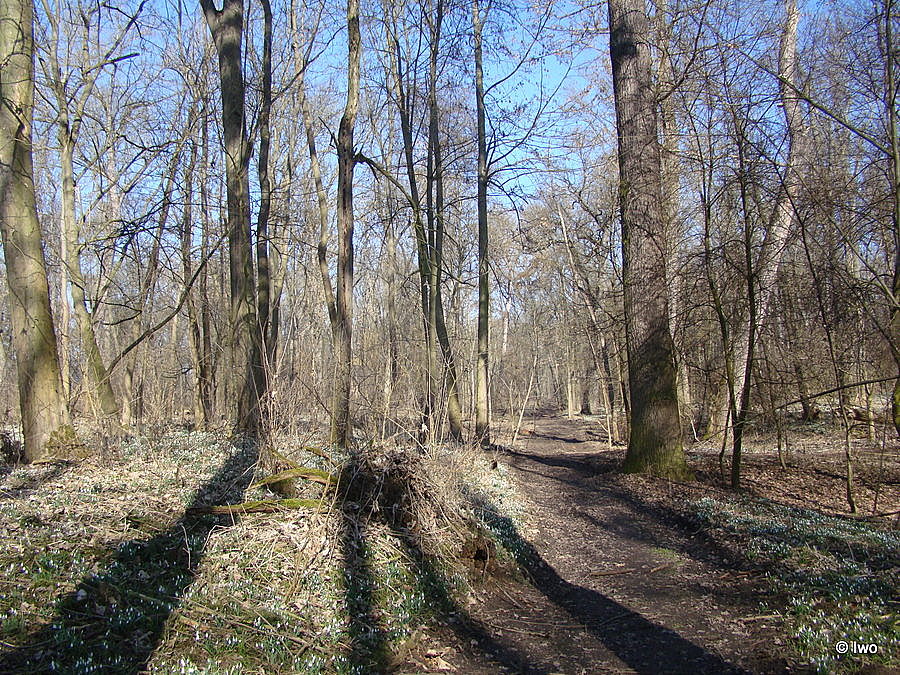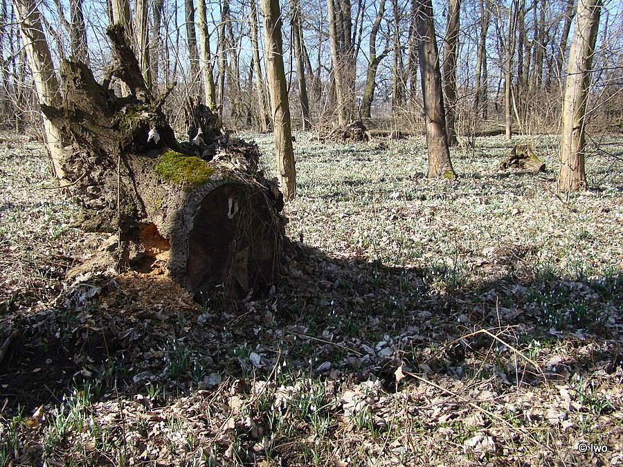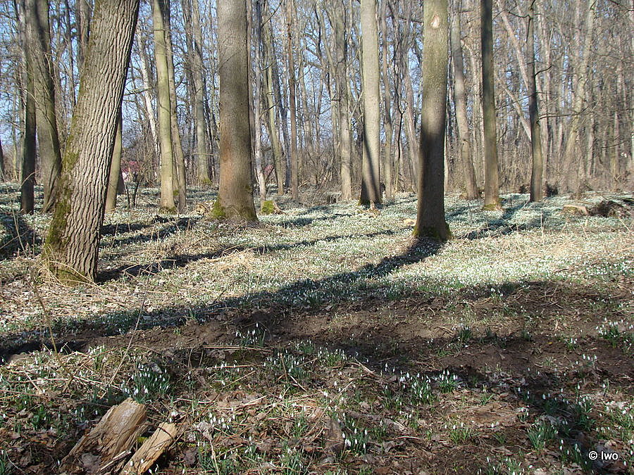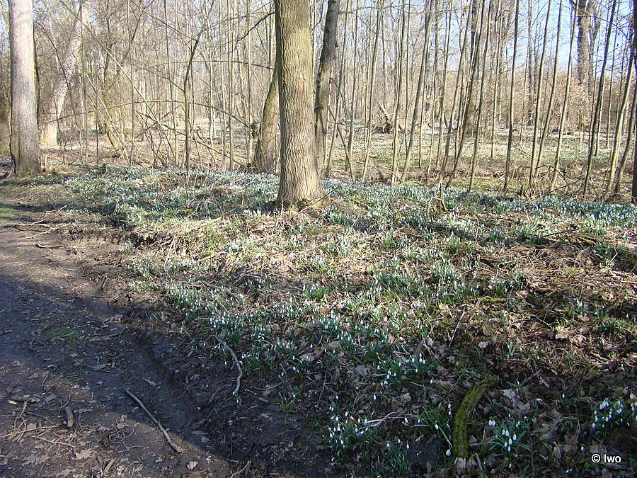 Rozlehlý lužní les protkaný cestičkami je za normálních okolností spíš jen zajímavým místem na procházky. Ovšem na jaře je lokalitou ohromující – kdo putuje do dálek za kvetoucími bledulemi, musí tady užasnout – nejde tu ale o bledule, nýbrž o sněženku podsněžník. Dosud jsem o existenci této byliny neměl tušení, což snad lze osvětlit citací z wiki: „V minulosti patřila sněženka podsněžník mezi nejrozšířenější jarní rostliny v Česku. V současné době ji řadíme mezi vzácné a částečně chráněné druhy, což je následkem především ztráty přirozeného biotopu, vykopávání zahrádkáři a trhání v době květu.“ A zbývá dodat, že já sem zamířil kvůli několika chráněným dubům.