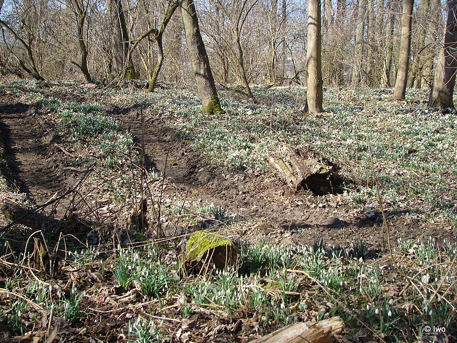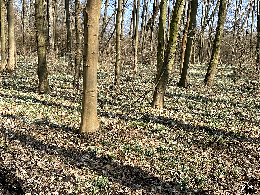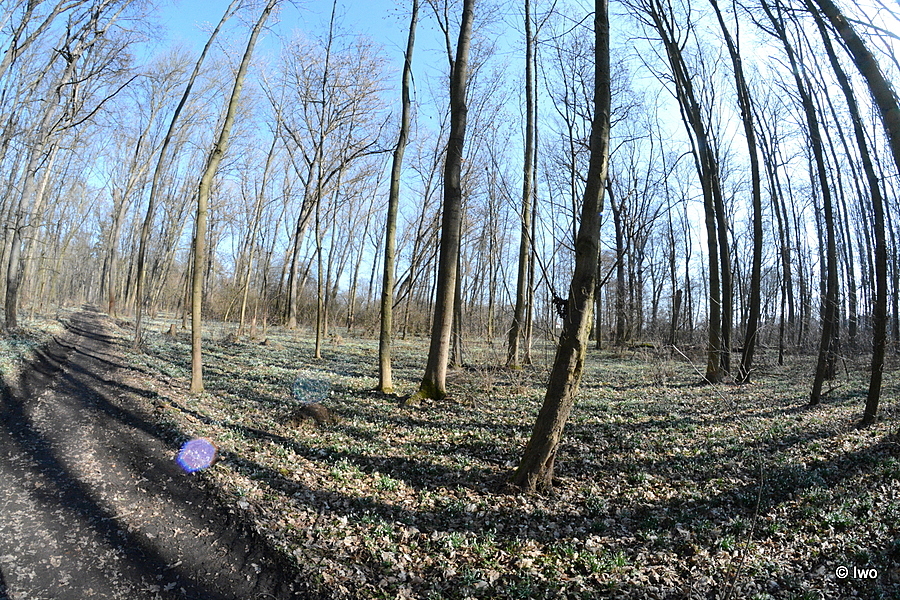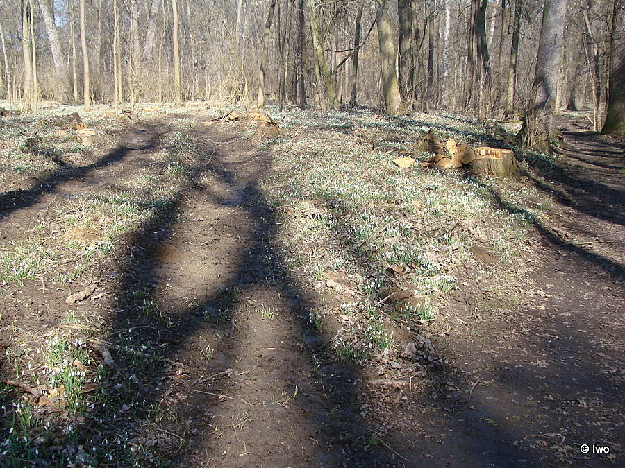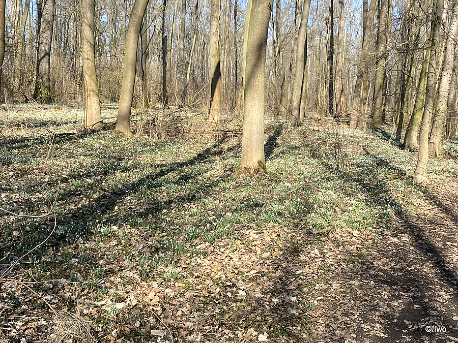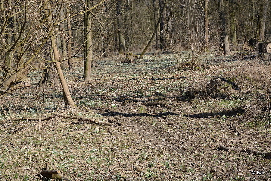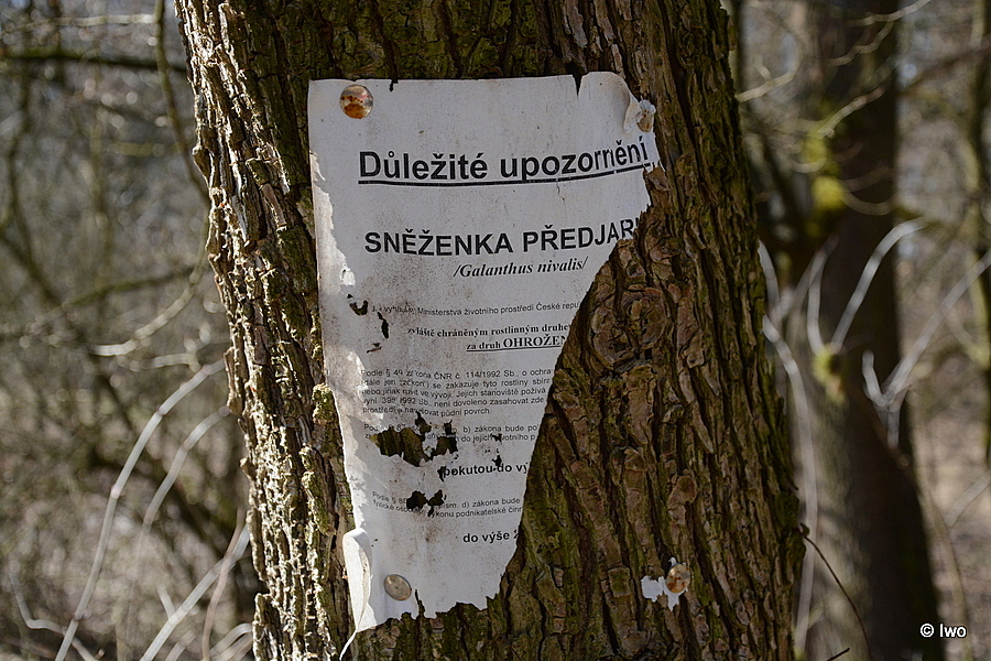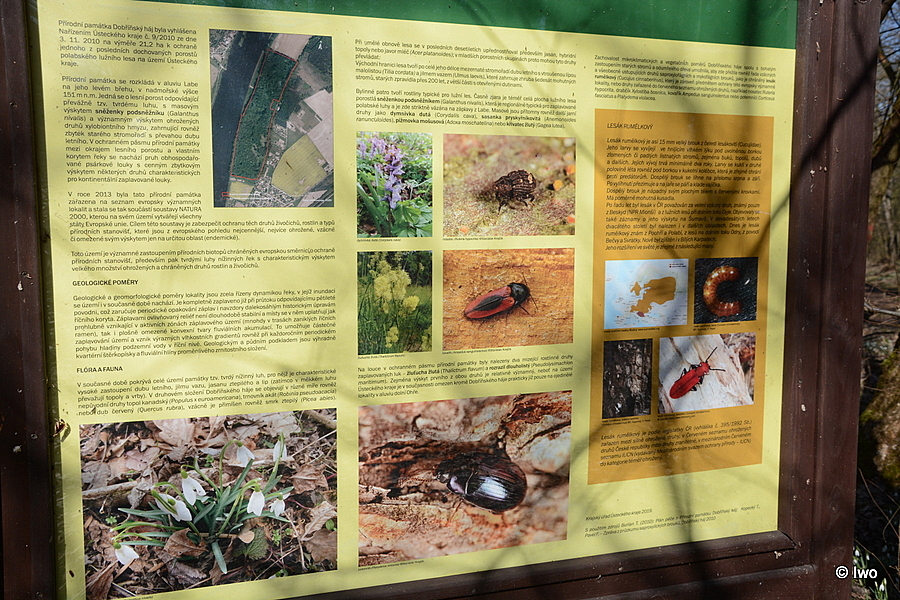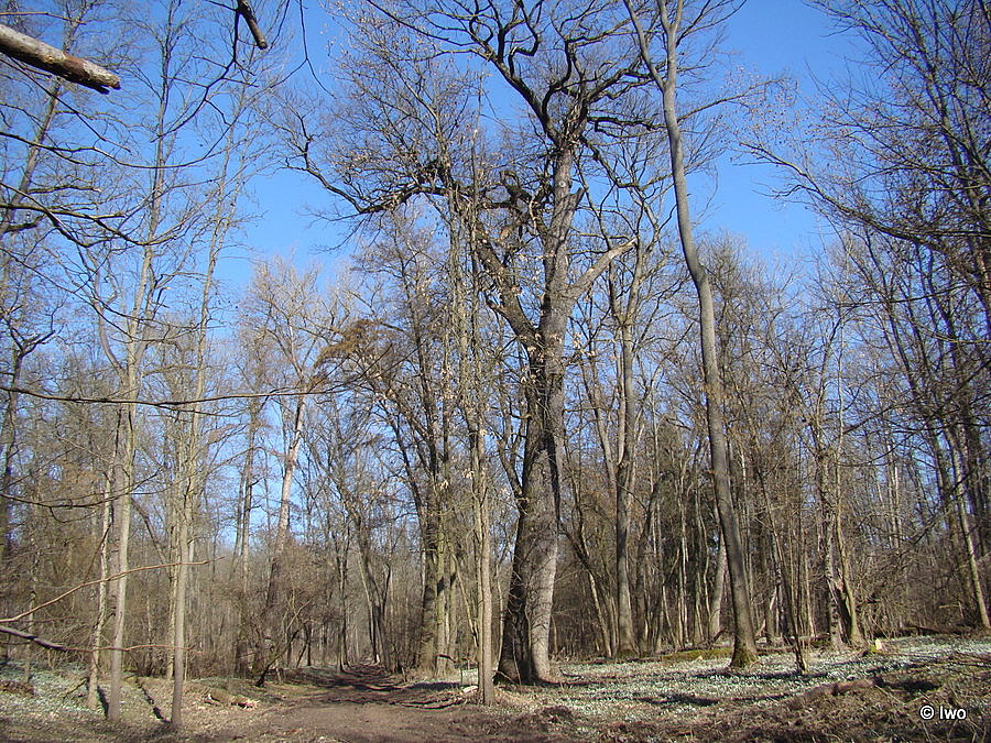 Rozlehlý lužní les protkaný cestičkami je za normálních okolností spíš jen zajímavým místem na procházky. Ovšem na jaře je lokalitou ohromující – kdo putuje do dálek za kvetoucími bledulemi, musí tady užasnout – nejde tu ale o bledule, nýbrž o sněženku podsněžník. Dosud jsem o existenci této byliny neměl tušení, což snad lze osvětlit citací z wiki: „V minulosti patřila sněženka podsněžník mezi nejrozšířenější jarní rostliny v Česku. V současné době ji řadíme mezi vzácné a částečně chráněné druhy, což je následkem především ztráty přirozeného biotopu, vykopávání zahrádkáři a trhání v době květu.“ A zbývá dodat, že já sem zamířil kvůli několika chráněným dubům.