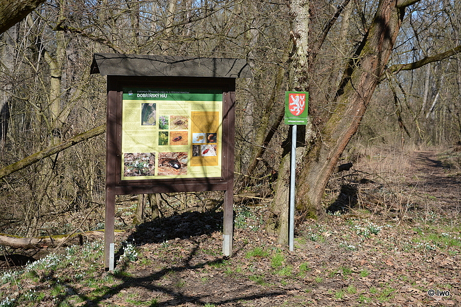 Obec Dobříň se nachází nedaleko Roudnice nad Labem. Přímo u obce se rozprostírá velký lužní háj, jeden z posledních dochovaných polabských lužních lesů na území Ústeckého kraje. Přírodní památka zde chrání lesní vegetaci s unikátním masovým výskytem chráněné a ohrožené sněženky podsněžníku a ohrožených druhů hmyzu. Do chráněného území patří i pozůstatek starého stromořadí s převahou velkolepých jedinců dubu letního. Celou přírodní scenérii doplňují ptáci z řádu pěvců.