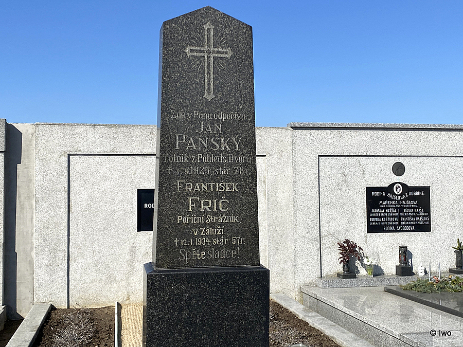 Různá příjmení, podle nápisu ani jeden místní. Pohledské Dvory nebo Pohledský Dvůr Google nedokáže objevit. Záluží je cca 3 kilometry daleko (a nemá vlastní hřbitov). Co asi ty dva spojovalo? Kde Jan vlastně hospodařil a co František u Labe strážil?