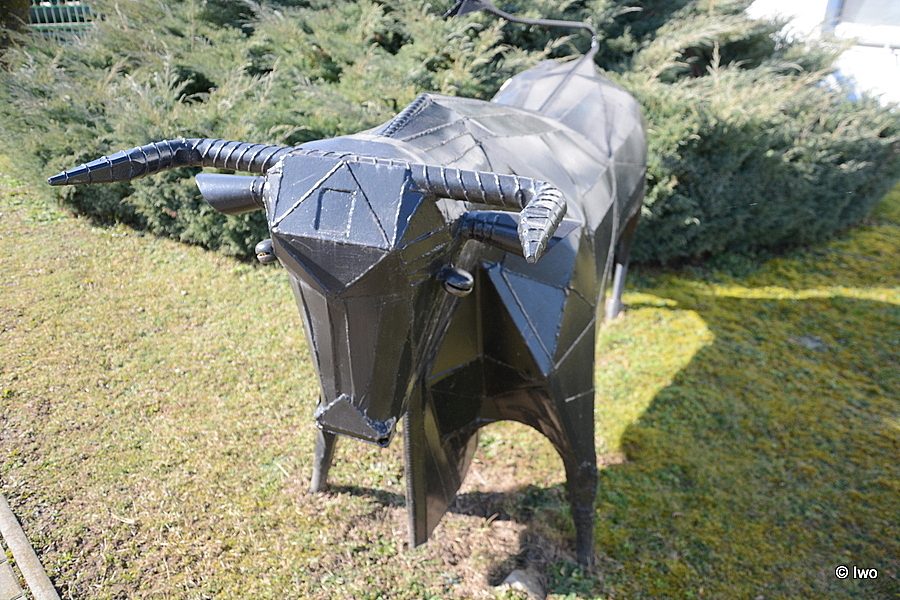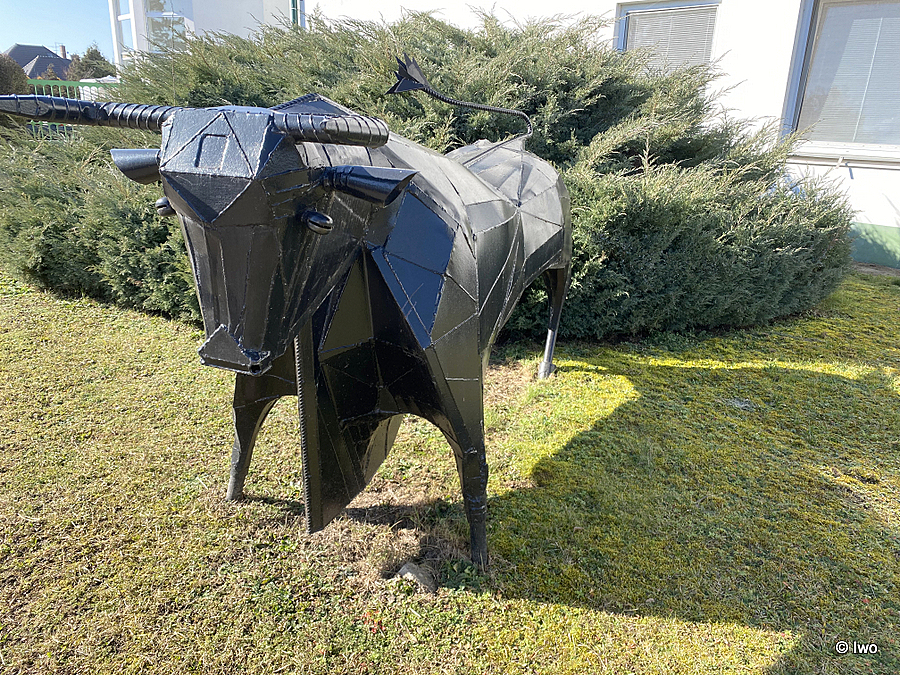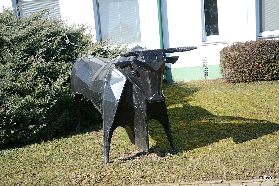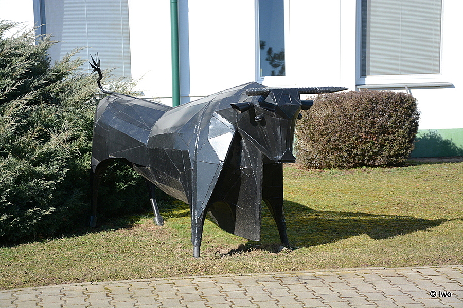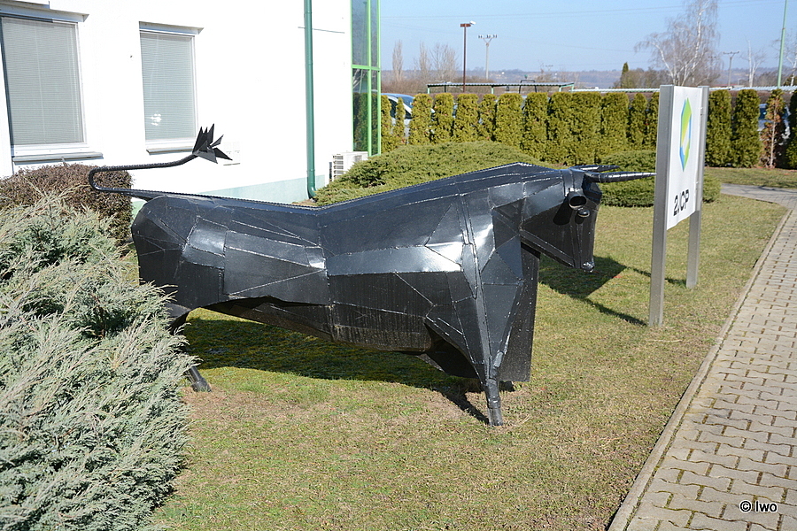 Na trávníku před areálem firmy 2JCP v Račicích stojí kovová socha býka.
