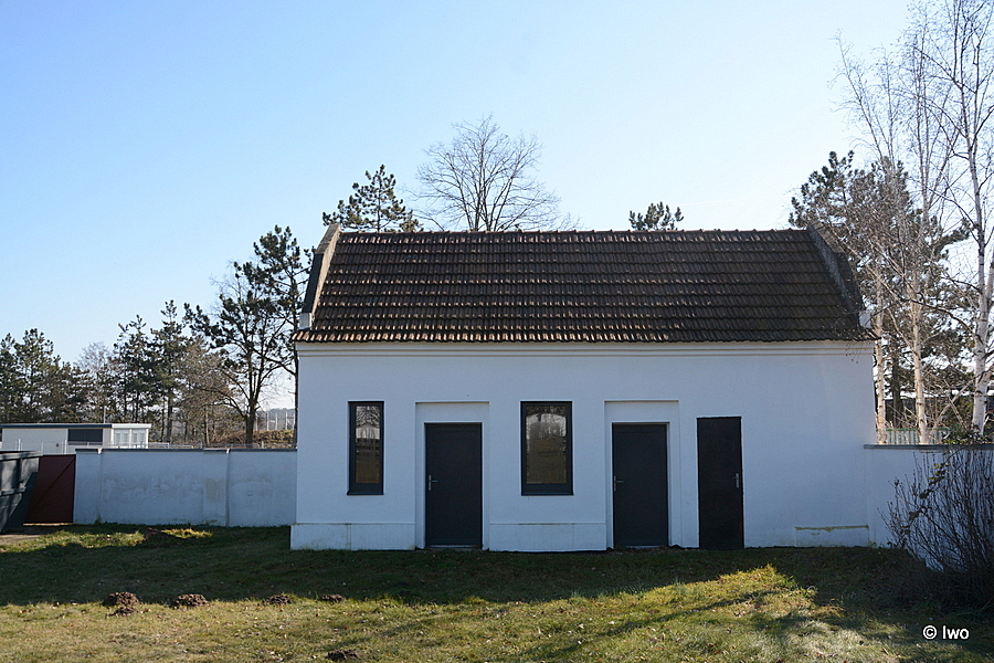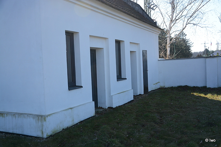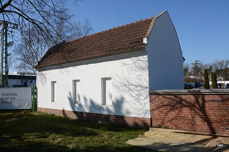 Zděná omítaná stavba obdélného půdorysu je zakomponována do ohradní zdi. Západní štítová stěna bez otvorů přivrácena do vedlejšího firemního areálu. Jižní okapní strana směrem do ulice se třemi zaslepenými obdélnými okenními otvory, ve spodní části cihlová podezdívka. Východní štítová stěna směrem ke vstupu na hřbitov hladká, bez otvorů. Okapní stěna směrem do hřbitova má dva okenní otvory, dvoje větší dveře se vpadlým portálem a na pravé ještě jedny dveře užší (možná vytvořené dodatečně). Střecha sedlová, krytá pálenou taškou.