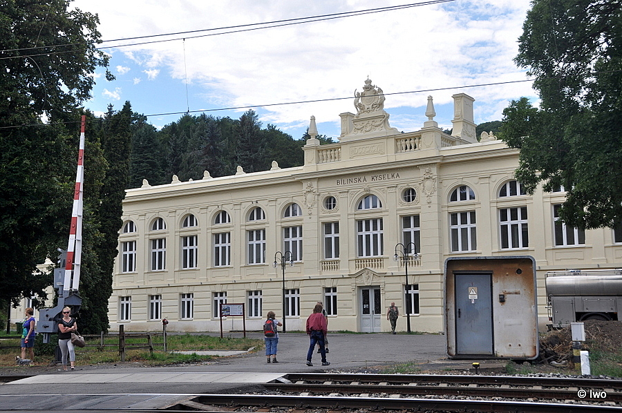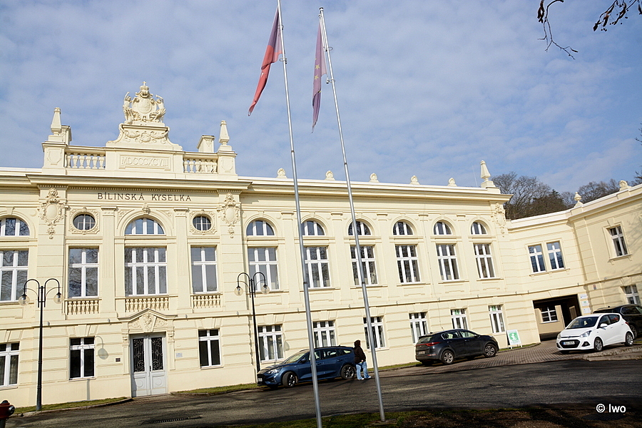 První budovou areálu lázní Bílina-Kyselka, kterou příchozí vidí, je bývalá stáčírna.