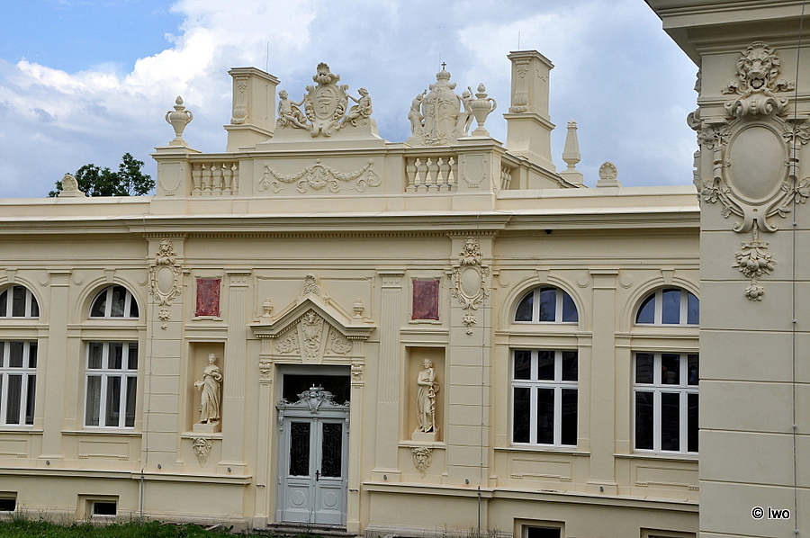Horní podlaží odděluje profilovaná římsa. Ve všech osách jsou okna, která jsou stejná – stejně jako celé členění fasády – jako v částech jihovýchodního průčelí hlavního křídla po stranách rizalitu. Nad hlavní římsou je nízká atika s nárožním obeliskem a šesti akroteriemi. Stejně je provedená i trojosá severozápadní fasáda bočního křídla, pouze zde díky terénu chybí dolní podlaží. Navíc jsou zde nárožní pilastry, provedené stejně jako u osy hlavního křídla na jihozápadní straně. Na atice jsou nárožní obelisky, mezi nimi dvě akroterie. Sedmiosé severovýchodní průčelí bočního křídla je provedené stejně jako jeho protějšek. Ve středu severozápadní fasády hlavního křídla je stejný rizalit jako na protější straně, po obou jeho stranách jsou tříosé úseky. Díky výšce terénu je zde dolní podlaží nízké. Ve středu rizalitu je vstup – dvoukřídlé dveře obdobného provedení jako na jihovýchodě. Zde však mají bohatěji zdobenou horní část, kde je nástavec, zasahující do obdélného proskleného nadsvětlíku. Uprostřed je oválná, na výšku orientovaná kartuše s volutovitě stáčenými okraji. V kartuši je ozdobné písmeno L, nad ní je knížecí koruna. Šambrána kolem dveří je podobného provedení jako na protější straně, s několika rozdíly: v hlavním klenáku je hlava lišky (?), pod ní je hornické náčiní, na trojúhelném frontonu je po stranách váza a v jeho vrcholu akroterie a pod ní dvě voluty.