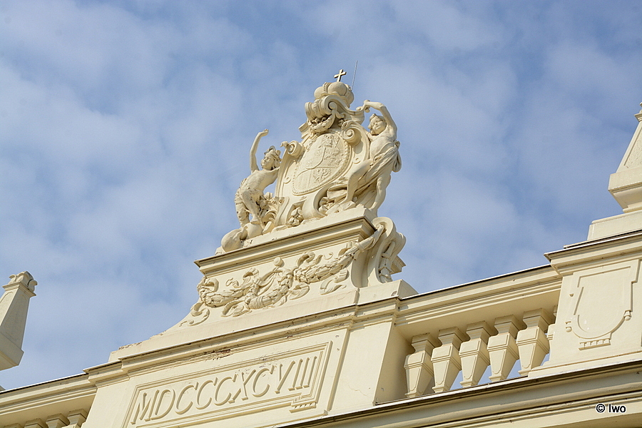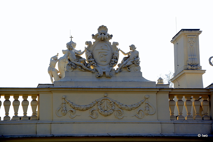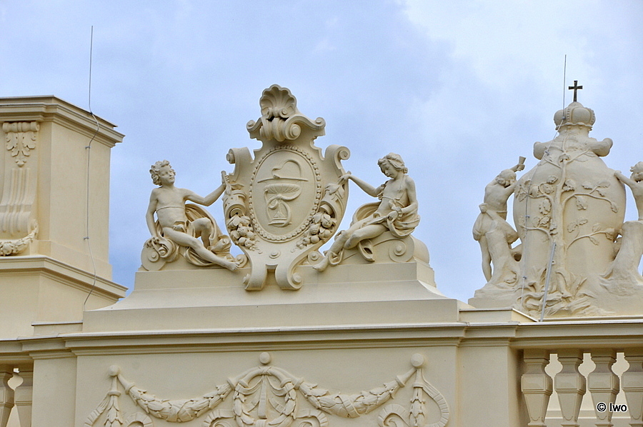 Nad profilovanou hlavní římsou se zvedá atika. Nad středním rizalitem je zde uprostřed plná stěna s lehce vystupujícím středem, v němž je obdélné pole s rozšířenými dolními rohy, opatřenými kapkami. V poli, lemovaném profilovaným okrajem, je plastický letopočet „MDCCCXCVIII“ (1898). Na plnou stěnu navazuje široký sokl s konkávními boky, opatřený reliéfní výzdobou. Jde o vavřínový věnec s propletenými stuhami, po obou stranách doplněný o vavřínový feston, rovněž se stuhami. Na soklu stojí nízký deskový podstavec s lobkovickým erbem. Štít má zavíjené okraje, přidržují ho dvě dětské postavy po stranách. Obě jsou nahé, situované en face, tělem se lehce přiklánějí k erbu. Levá postava (z hlediska pozorovatele) má nakročenou levou nohu, mezi nohama vede haluz s listy, které kryjí klín a pravý bok. Natažená pravá ruka směřuje vzhůru, pravá se opírá o štít. Na hlavě, lehce nakloněné k levému rameni, jsou polodlouhé vlasy, členěné do výrazných pramenů. Pravá postava má nakročenou levou nohu, klín kryje dlouhá rouška, přecházející zezadu přes levý bok a vedoucí mezi nohama směrem ke štítu. Zdvižená levá paže je ohnutá v lokti dozadu, ruka drží úzký pohár. Pravá ruka spočívá na štítu. Hlava je mírně nakloněná k levému rameni, krátké vlasy jsou zvlněné. Na zadní straně štítu je reliéf stylizovaného stromu, snad dubu.