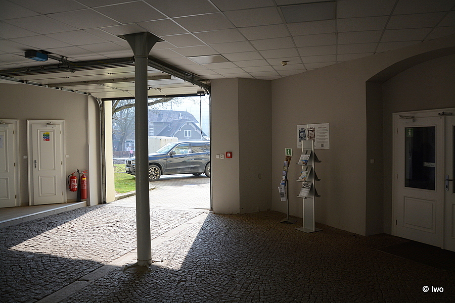 V jeho jihovýchodní stěně je velký, segmentově zakončený otvor pro vrata, dnes s prosklenou výplní, členěnou četnými příčlemi. Na protější straně jsou v otvoru pro vrata pouze dveře běžné velikosti, zbytek otvoru je zazděný. Krček má sedlovou střechu, krytou asfaltovým šindelem. Na krček navazuje sklad protáhlého obdélného půdorysu. Jde o přízemní objekt, členěný pásovou bosáží a lizénami, jednotlivé otvory pro okna a vrata jsou segmentově zaklenuté. Sedlová střecha, kryjící zápraží, má krytinu z šablon asfaltového šindele. Na obou koncích budovy je do ní vložená příčná sedlová střecha, více přesahující, pod níž je ozdobně vyřezávaná dřevěná konstrukce. V hřebeni hlavní střechy objektu je v její střední části vložen prosklený světlík se sedlovou střechou s asfaltovým šindelem.