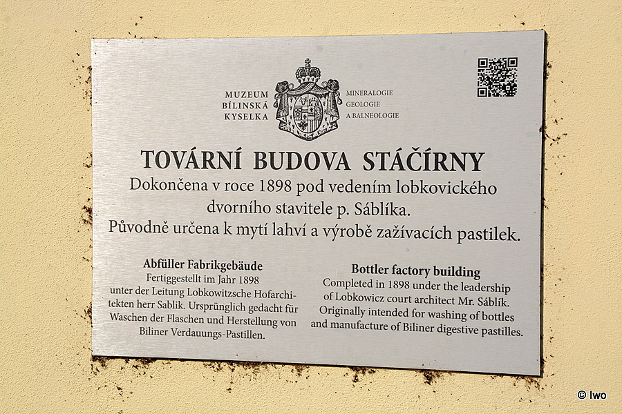 Původní záměr a účel: Tovární budova byla vystavěna pro zvýšení kapacity výroby stáčírny v roce 1898. Byly zapotřebí nové kapacity pro mytí džbánků a lahví a dvě nová pracoviště výroby Bílinských zažívacích pastilek. Kníže Mořic Lobkovic spolu s dvorním stavitelem architektem Sáblíkem navrhli tovární budovu do podoby zámku, který svou výstavností ospravedlní fakt, že budova zakrývá výhled na čelo lázeňského areálu. Zajímavostí je, že se zachoval zcela první náčrtek, na kterém se Mořic Lobkovic se Sáblíkem dohodli na konceptu stavby.