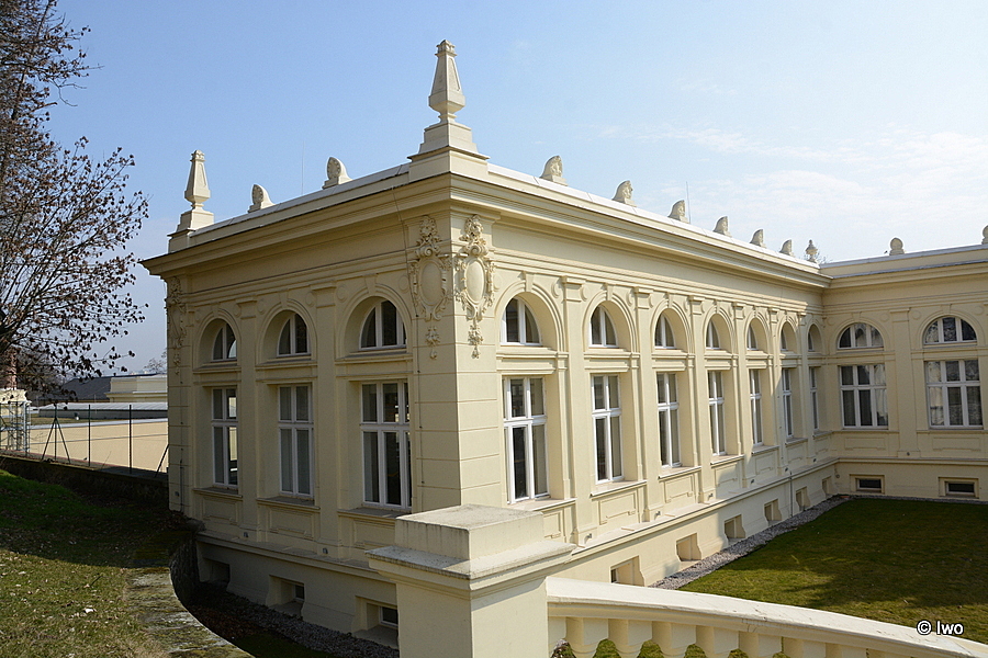 Nad plochou římsou je vedle oken triglyf, hlavní římsa je profilovaná. Nad ní se zvedá atika, tvořená třemi poli se sedmnácti kuželkami, za nimiž je plná stěna. Pole odděluje pilířek, na němž stojí váza (až na užší pilířek u styku s hlavním křídlem, kde je místo ní voluta, přiložená ke stěně hlavního křídla). Váza má kruhovou základnu, štíhlou nohu, širokou mísu, zdobenou girlandou a kuželovitou členitou horní část. Hladká jihozápadní stěna přístavby je bez otvorů. U nároží jsou opět lizény s pásovou bosáží, stejná je i plochá a hlavní římsa. Nahoře je i zde atika s balustrádou s vázami, avšak její tři pole jsou o něco užší. Severozápadní stěna přístavby má členění obdobné jako její protějšek, avšak pásová bosáž je pouze u nárožní lizény. Ve třech osách jsou vpadlá obdélná, na šířku orientovaná pole (patrně po původních oknech), v nichž jsou dnes v horní části pouze nízké štěrbinové průzory. Atika je stejná jako na jihovýchodě.