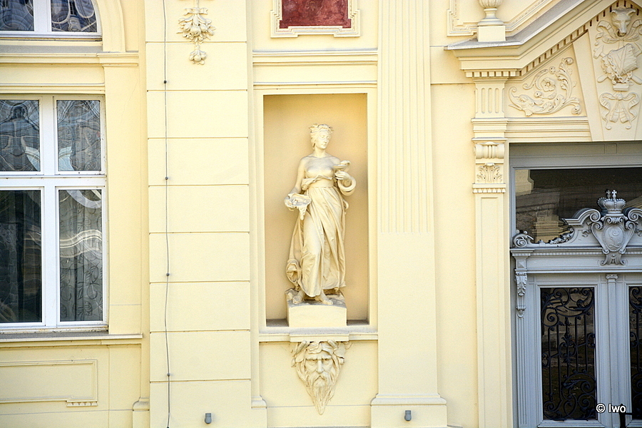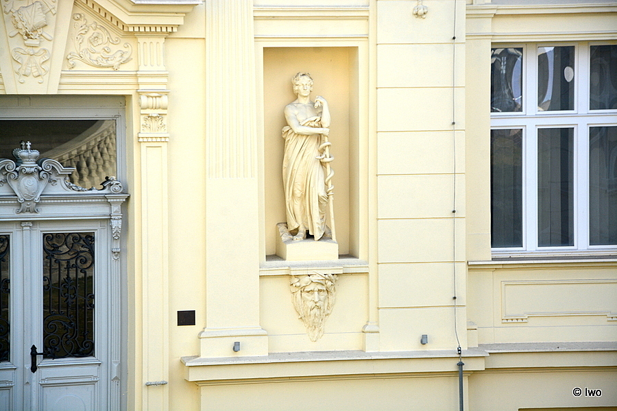 Po obou stranách vstupu a u nároží rizalitu jsou stejné pilastry jako na jihovýchodě. Vpravo a vlevo od vstupu se nachází obdélná nika se sochou. Vpravo je to postava Aeskulapa. Je zobrazen čelně, stojící s odlehčenou levou nohou na obdélném podstavci s náznakem terénu. Oděn je do řasnatého roucha, pod nímž se rýsují obě nohy. Roucho odkrývá obě ramena a horní část trupu, vede pod pravou paží. Ta je ohnutá v lokti před tělem, ruka přidržuje hůl, opřenou vedle mužovy levé nohy. Hůl je obtočena hadem. Také levá paže je ohnutá v lokti, předloktí směřuje vzhůru, ruka drží svitek. Na hlavě s kučeravými krátkými vlasy je vavřínový věnec. Vlevo od vstupu se nachází socha Hygie. Čelně stojící mladá žena má odlehčenou pravou nohu. Její řasnatý šat je přepásaný pod ňadry, která jsou odhalená. Pravá paže je ohnutá v lokti, ruka přidržuje neidentifikovaný předmět (snad lastura?). Levá paže je rovněž ohnutá v lokti. Kolem ní a předloktí se obtáčí had, pijící z miskovitého poháru, který žena drží rukou. Hlava je mírně nakloněná k levému rameni, žena hledí na hada. Dlouhé vlasy Hygie jsou zřejmě sčesané do drdolu, na hlavě jsou snítky vavřínu (?).
