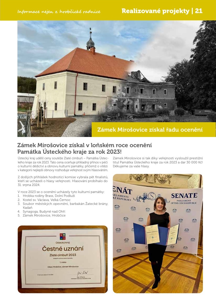 9. května 2020 – Památkově chráněný zámek Mirošovice z 16. století, který se nachází v katastrálním území Hrobčic na Teplicku, se brzy dočká zásadní opravy. Zchátralý objekt zrekonstruuje obec Hrobčice, která na to získá dotaci ve výši 41,6 milionu korun.