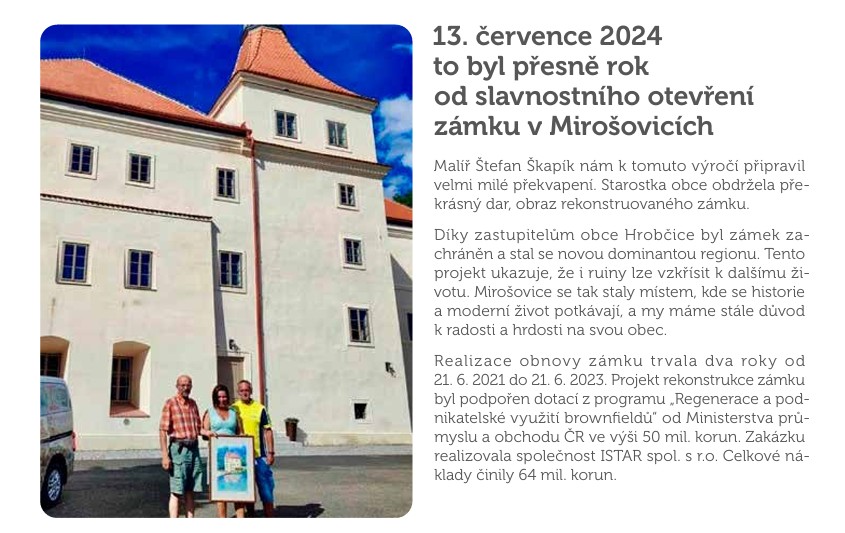 13.07.2023 – Po dvou letech oprav si dnes veřejnost poprvé mohla prohlédnout barokní zámeček v Mirošovicích na Teplicku. Na torzu historické stavby se vystřídalo několik desítek dělníků, řemeslníků a restaurátorů. Upravena je i příjezdová cesta a interiér. Na okraji Českého středohoří tak přibyl významný bod na mapě opravených kulturních památek, a to díky malé obci Hrobčice, která se do rekonstrukce pustila.